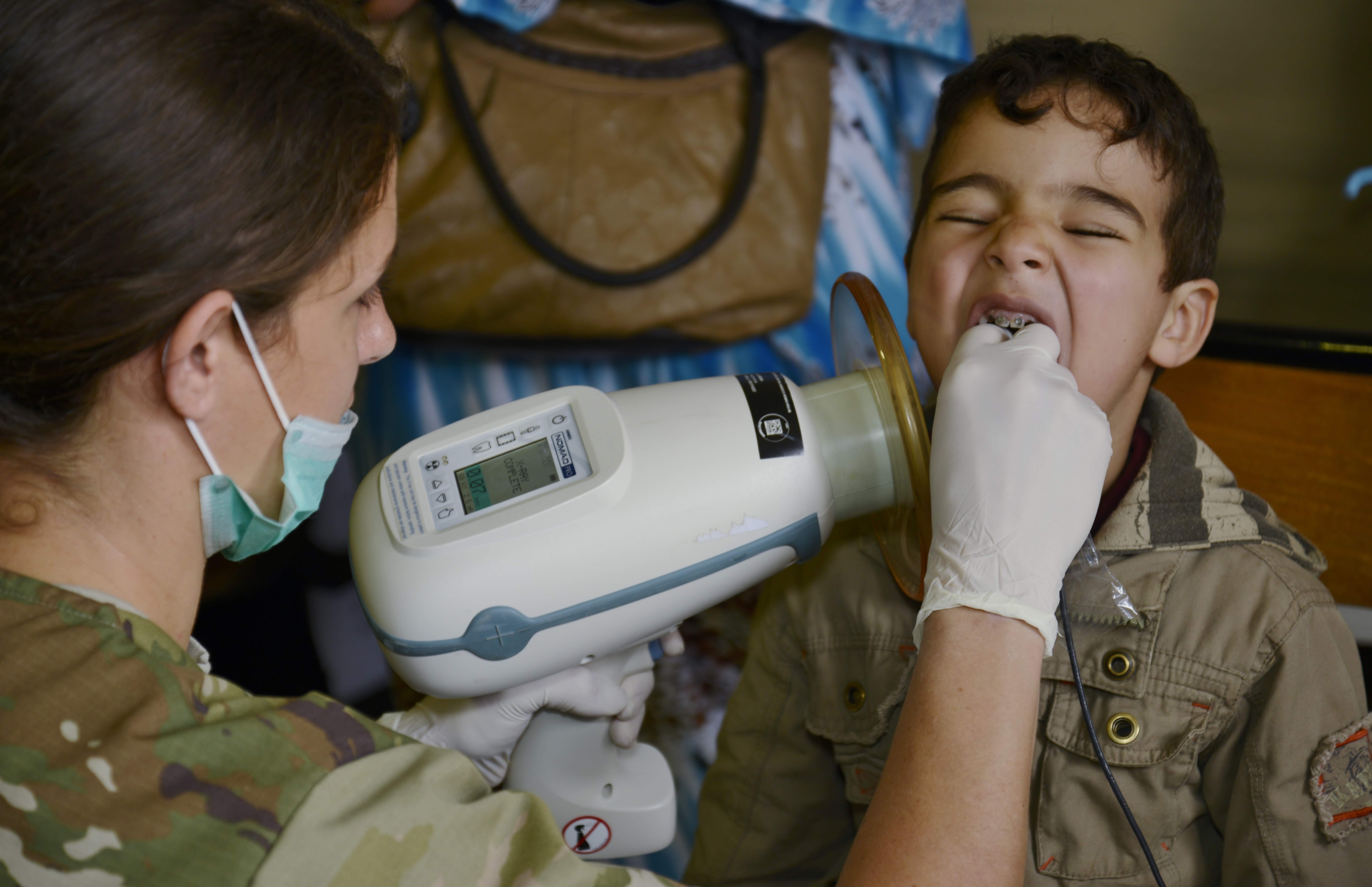 Sergeant Samantha Miller, a dental technician and member of the Utah Army National Guard, takes a dental x-ray on a boy during the Humanitarian Civic Assistance component of Exercise African Lion 2018 in Bounaamane, Morocco, April 24, 2018. Exercise African Lion 2018 is a Chairman of the Joint Chiefs of Staff-sponsored, U.S. African Command-scheduled, U.S. Marine Corps Forces Europe and Africa-led, joint and combined exercise conducted in the Kingdom of Morocco. African Lion offers an opportunity to improve interoperability and cooperation while demonstrating the strong military bond that exists between the participating nations. (U.S. Army National Guard photo by Maj. Samantha Madsen)