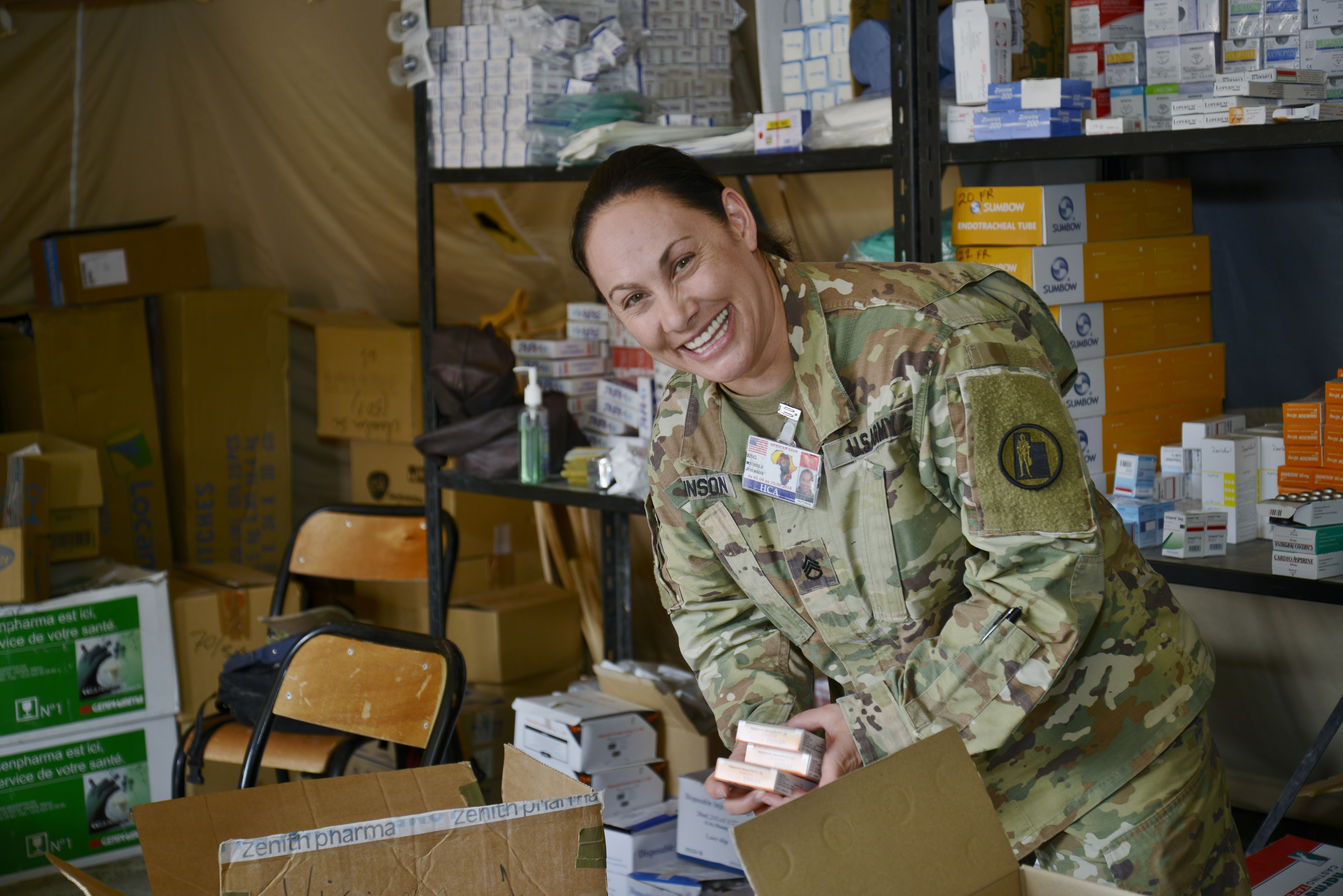 Staff Sergeant Michele Johnson, a patient administration technician with Utah Army National Guard, organizes the pharmacy during the Humanitarian Civic Assistance component of Exercise African Lion 2018 in Bounaamane, Morocco, April 25, 2018. Exercise African Lion 2018 is a Chairman of the Joint Chiefs of Staff-sponsored, U.S. African Command-scheduled, U.S. Marine Corps Forces Europe and Africa-led, joint and combined exercise conducted in the Kingdom of Morocco. African Lion offers an opportunity to improve interoperability and cooperation while demonstrating the strong military bond that exists between the participating nations. (U.S. Army National Guard photo by Maj. Samantha Madsen)