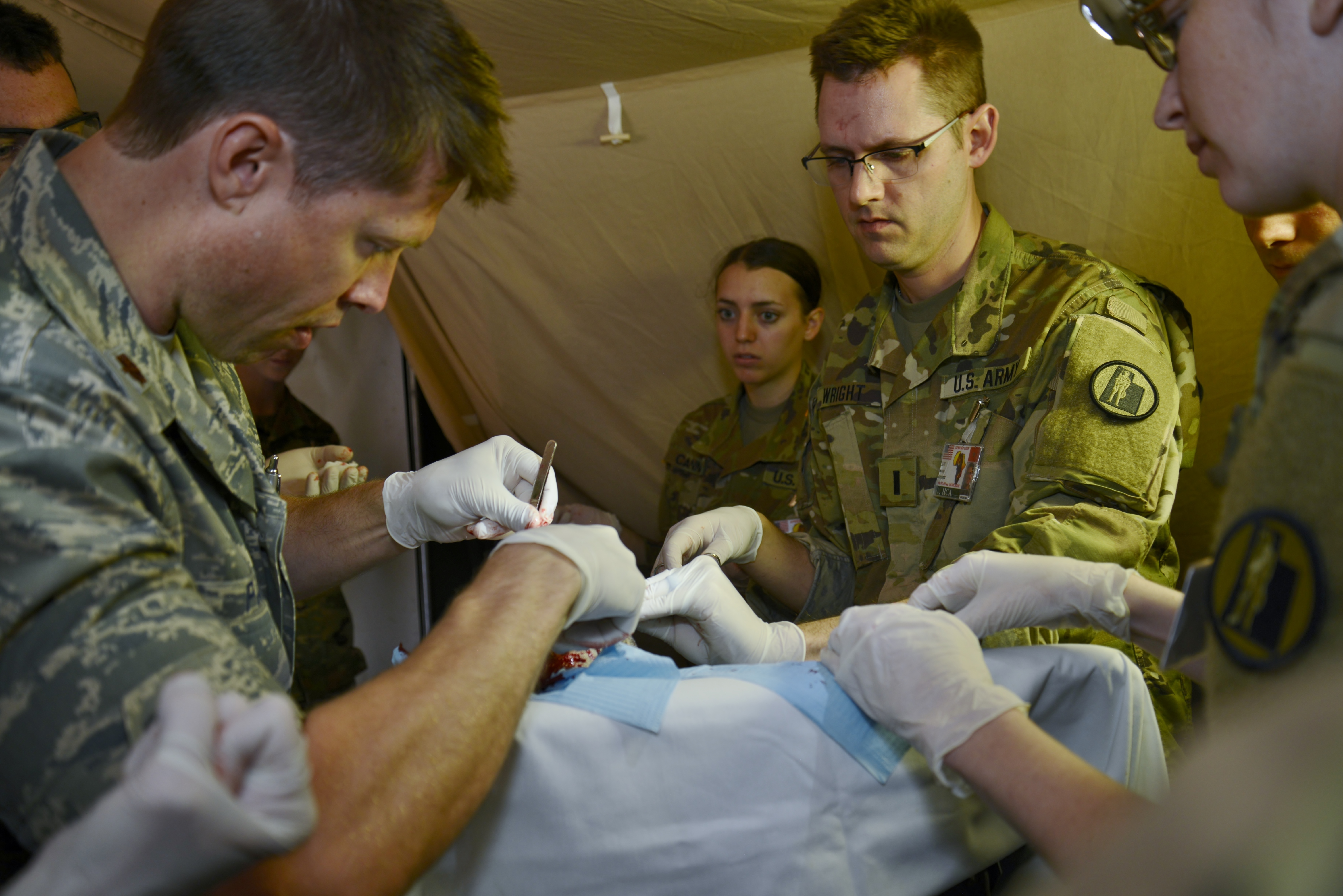 Major Jason Patten, a physician with Colorado Air National Guard, works on a man in the dermatology tent, as 1st Lt. FIRST NAME Wright, a physician’s assistant, and Spc. Ashley Ewell, a medic, both members of the Utah Army National Guard, assist with the procedure during the Humanitarian Civic Assistance component of Exercise African Lion 2018 in Bounaamane, Morocco, April 24, 2018. Exercise African Lion 2018 is a Chairman of the Joint Chiefs of Staff-sponsored, U.S. African Command-scheduled, U.S. Marine Corps Forces Europe and Africa-led, joint and combined exercise conducted in the Kingdom of Morocco. African Lion offers an opportunity to improve interoperability and cooperation while demonstrating the strong military bond that exists between the participating nations. (U.S. Army National Guard photo by Maj. Samantha Madsen)