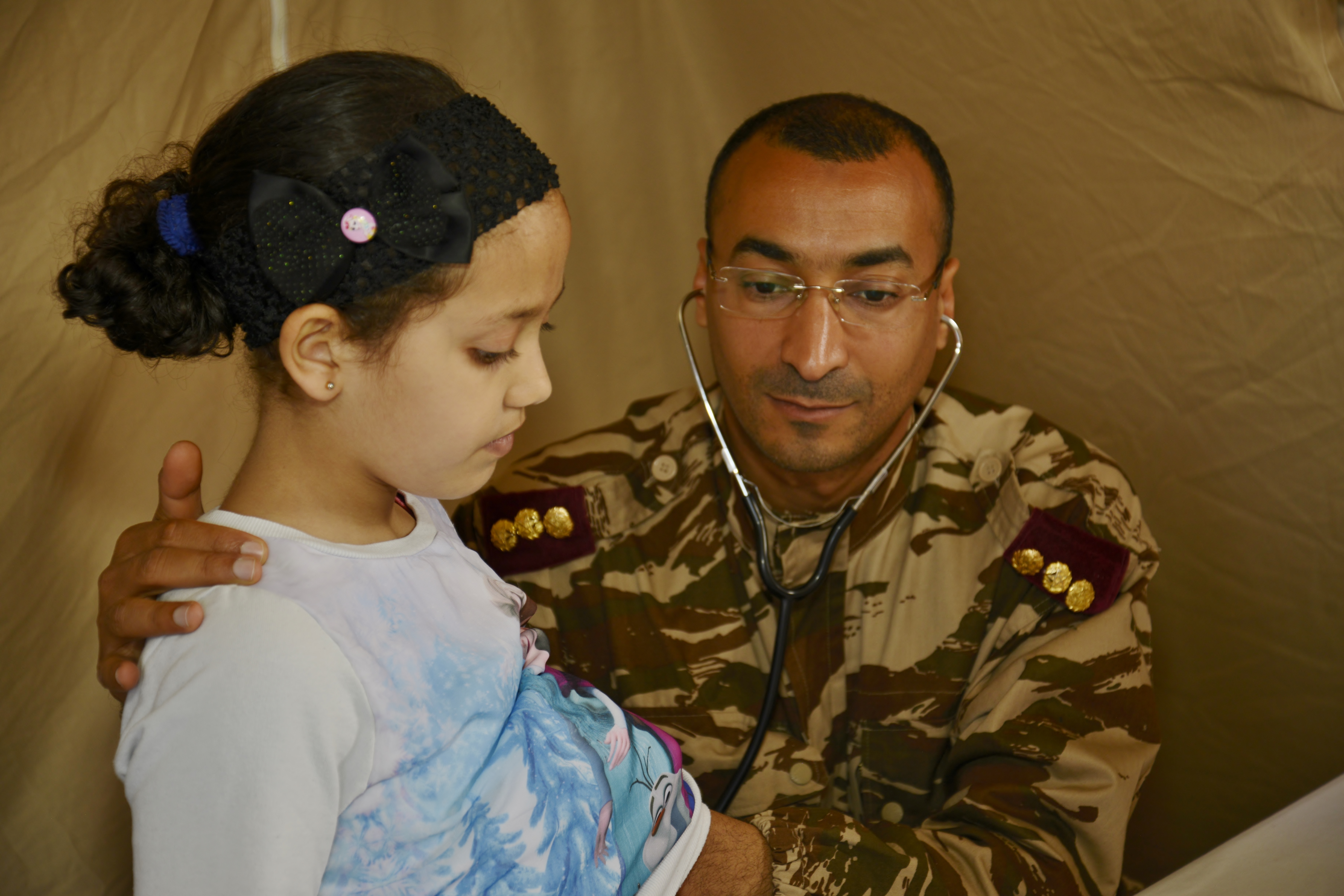 Moroccan Capt. Abdelilah Radi, a pediatrician with the Moroccan Royal Armed Forces, checks the heart of a girl during the Humanitarian Civic Assistance component of Exercise African Lion 2018 in Bounaamane, Morocco, April 24, 2018. Exercise African Lion 2018 is a Chairman of the Joint Chiefs of Staff-sponsored, U.S. African Command-scheduled, U.S. Marine Corps Forces Europe and Africa-led, joint and combined exercise conducted in the Kingdom of Morocco. African Lion offers an opportunity to improve interoperability and cooperation while demonstrating the strong military bond that exists between the participating nations. (U.S. Army National Guard photo by Maj. Samantha Madsen)