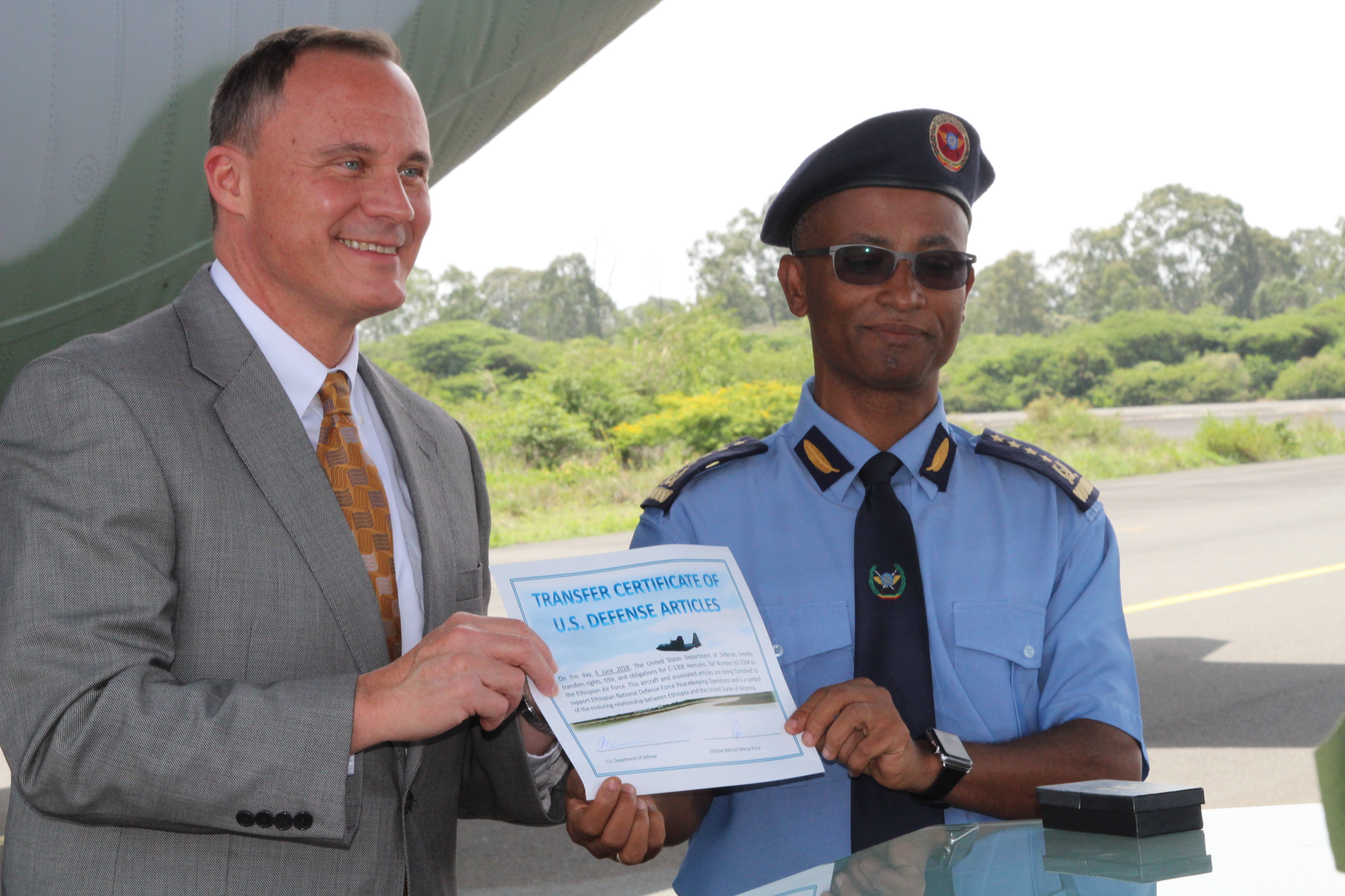 U.S. Ambassador to Ethiopia Michael Raynor participated in a ceremony to deliver the aircraft on behalf of the U.S. Government to Ethiopian Air Force Head, General Adem Mohammed.