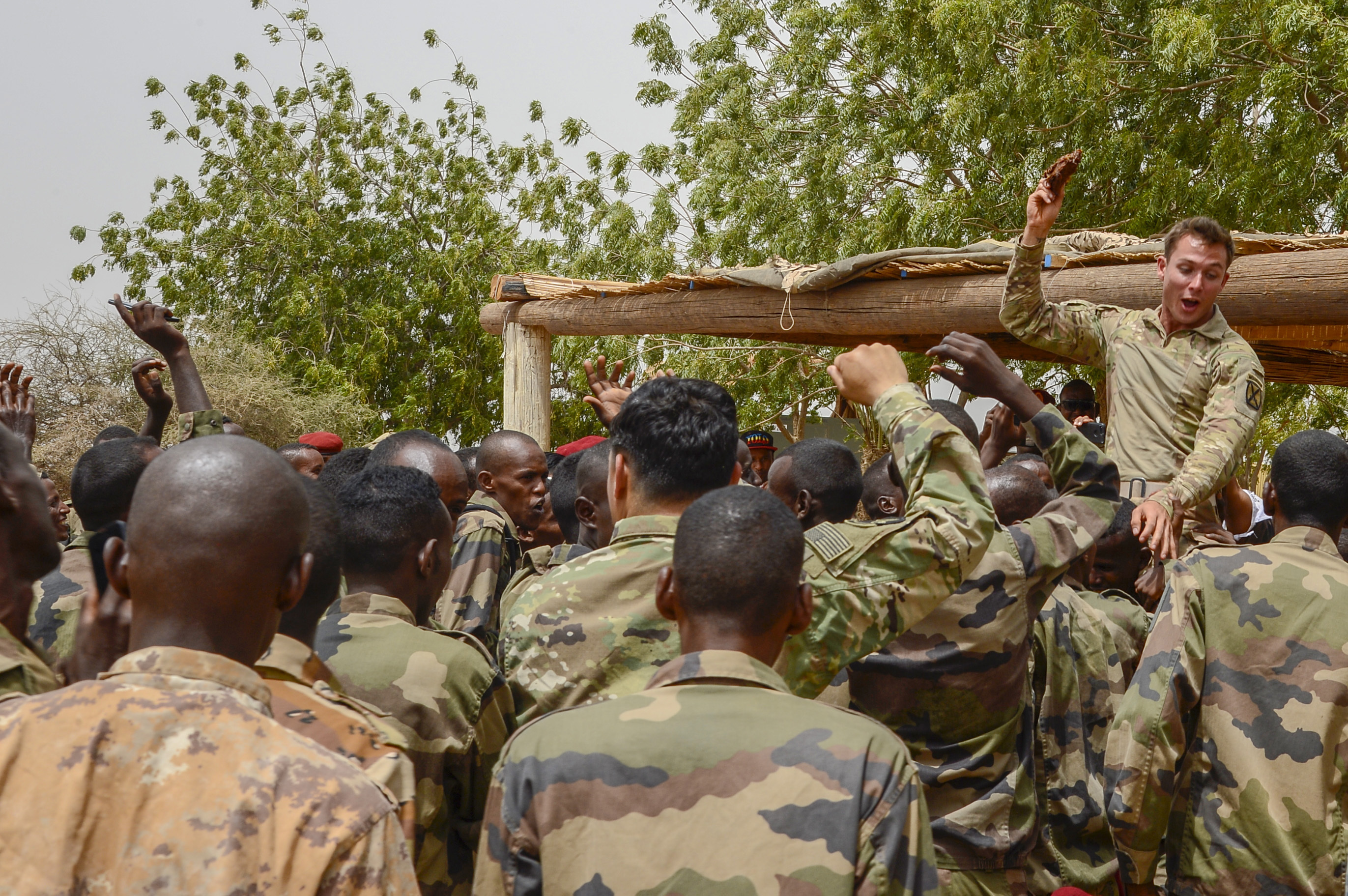 U.S. Army Spc. Travis Flynn, Alpha Company, 1st Battalion, 32nd Infantry Regiment, 1st Brigade Combat Team, 10th Mountain Division, celebrates with members of the Djiboutian Army’s Rapid Intervention Battalion (RIB) following a celebration for new RIB graduates at a training site outside Djibouti City, June 28, 2018. The RIB is a U.S. Army trained unit that was formed to respond to crises and promote regional security and stability in East Africa. (U.S. Navy Photo by Mass Communication Specialist 2nd Class Timothy M. Ahearn)