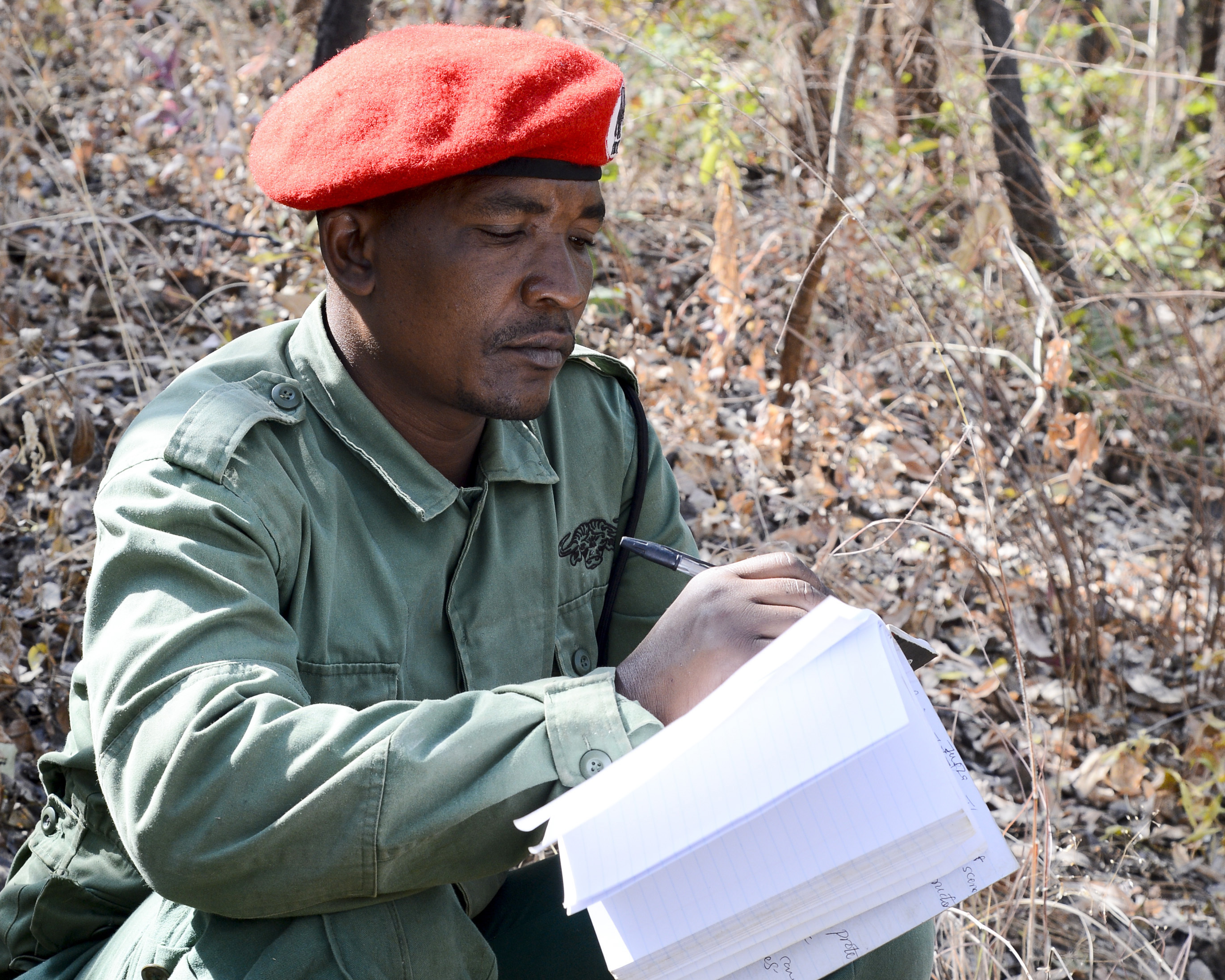A Tanzania Wildlife Management Authority (TAWA) patrol game warden takes notes during a ground surveillance practical exercise during a Counter Illicit Trafficking course, in Ngwala, Tanzania, July 24, 2018. The course provided by U.S. Army Soldiers with the 404th Civil Affairs Battalion, assigned to Combined Joint Task Force-Horn of Africa is a month-long course to enhance TAWA's anti-poaching capabilities in Tanzania. (U.S. Navy Photo by Mass Communication Specialist 2nd Class Timothy M. Ahearn)