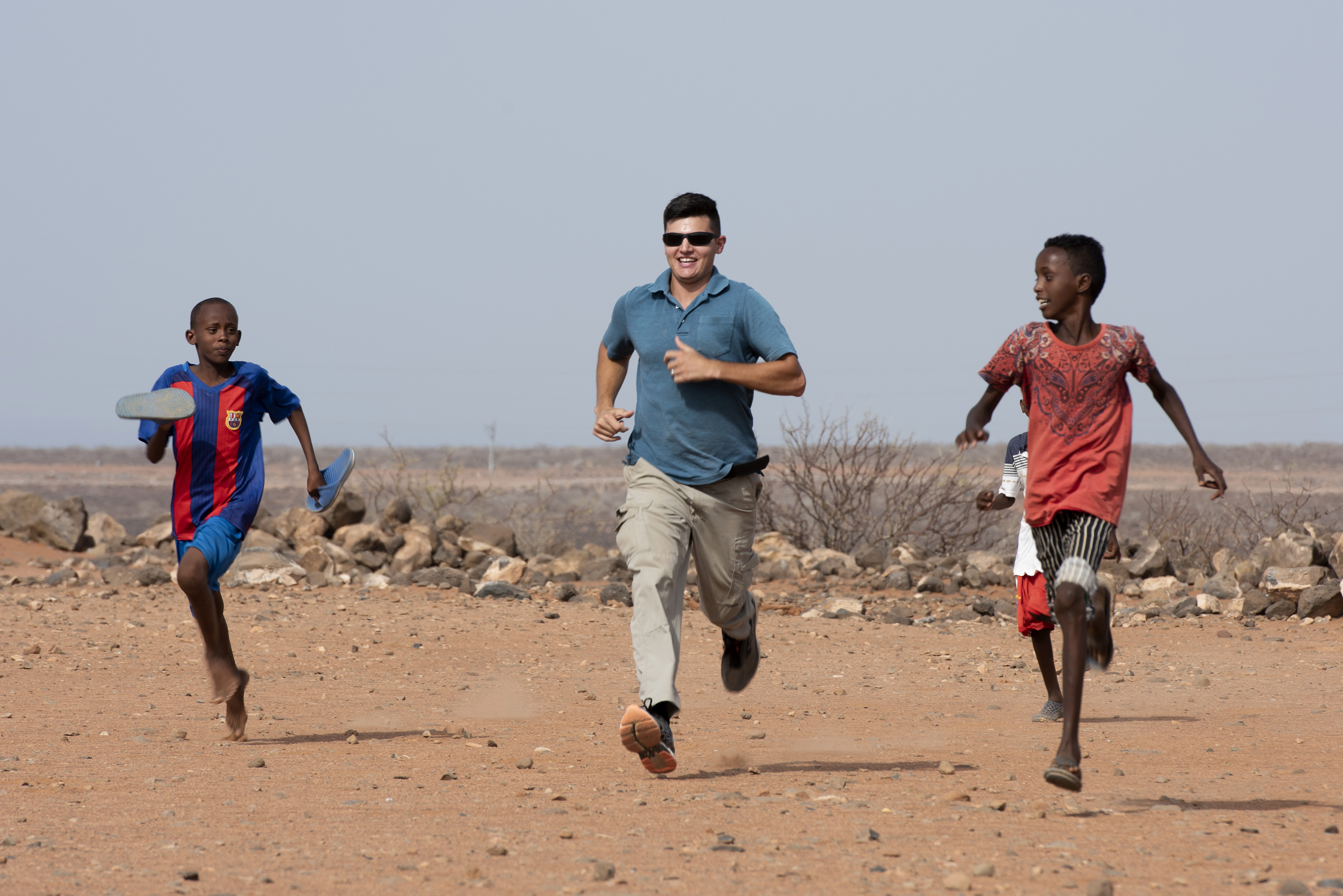 U.S. Army Sgt. Eythan Caputo, a civil affairs specialist with the 404th Civil Affairs Battalion, races with children from the local village outside of Chebelley Village, Djibouti, Aug. 3, 2018. Caputo was one of 30 service members participating in a outreach event organized by the 404th Civil Affairs Battalion. (U.S. Air National Guard photo by Master Sgt. Sarah Mattison)