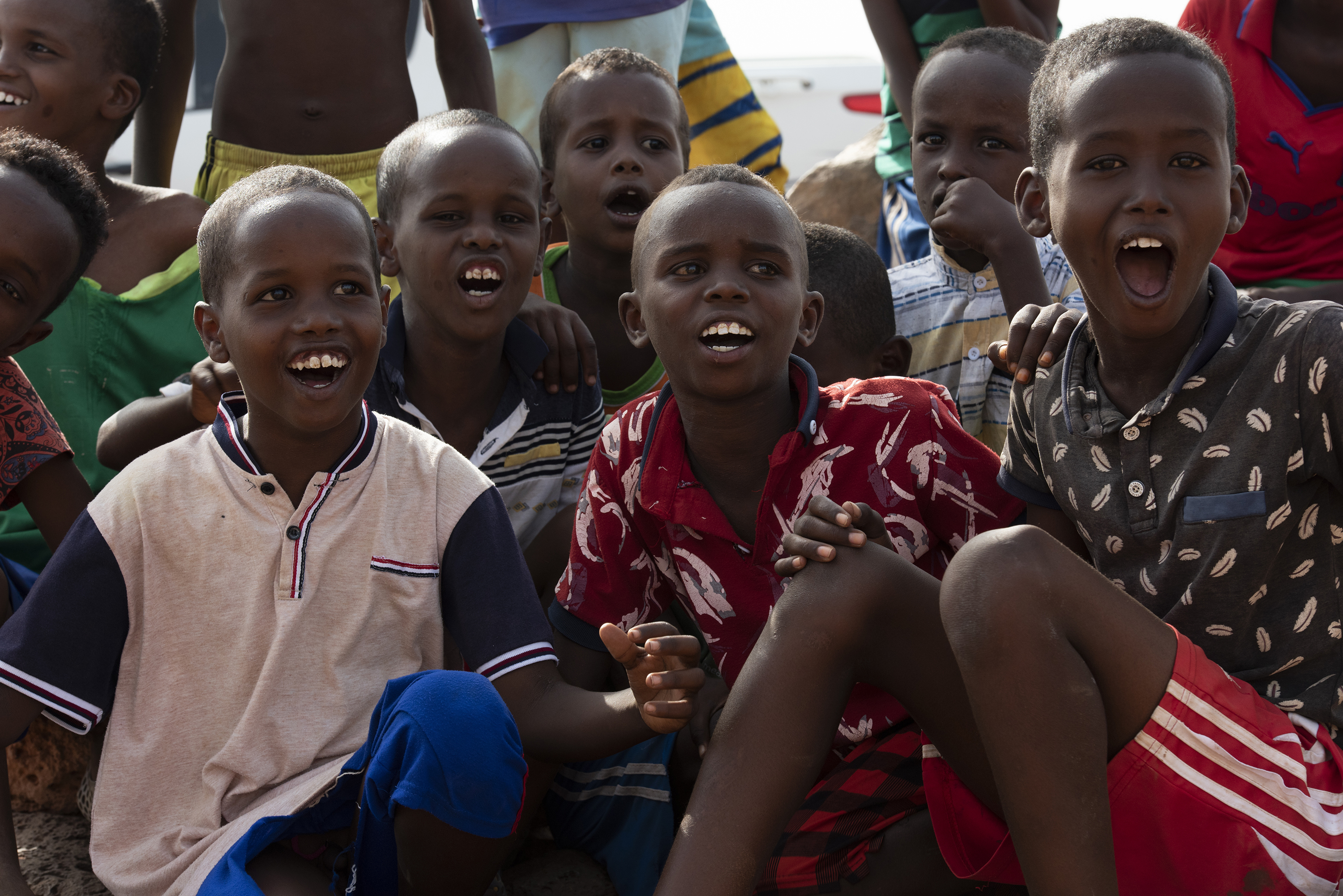 Djiboutian children from Chebelley Village gather before playing soccer outside of Chebelley Village, Djibouti, Aug. 3, 2018. The 404th Civil Affairs Battalion organized an outreach event that included 30 service members from Combined Joint Task Force - Horn of Africa. (U.S. Air National Guard photo by Master Sgt. Sarah Mattison)