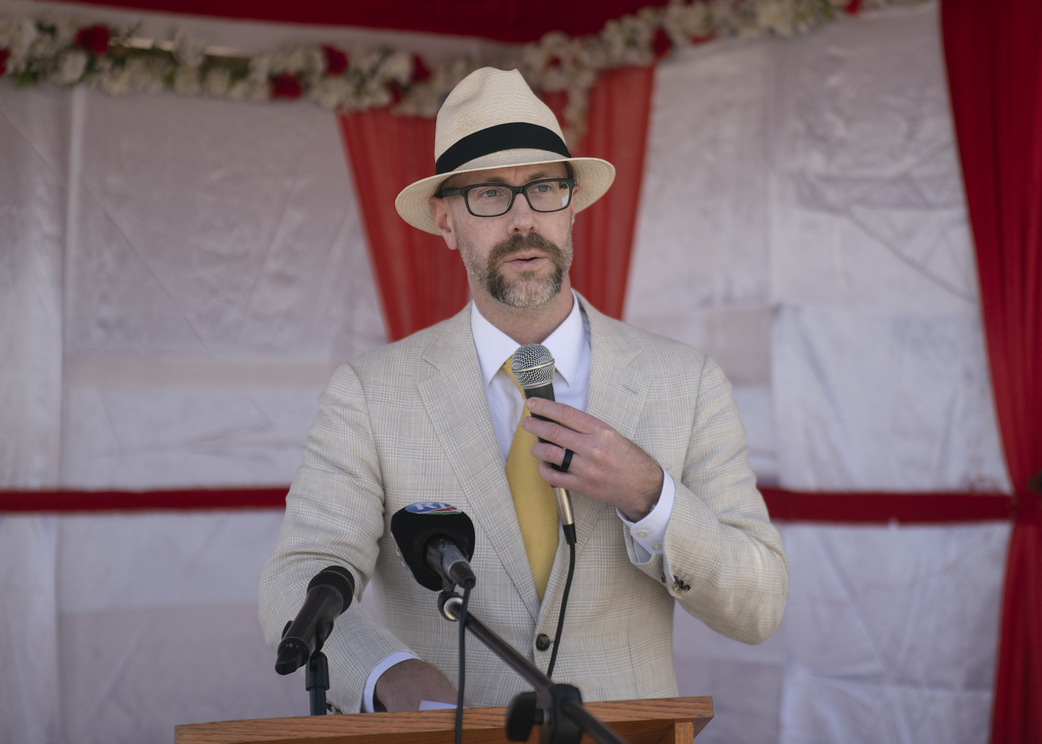 Alexander Hamilton, chargé d’ affaires to the U.S. Ambassador to Djibouti, gives a speech during the Ali Oune Medial Clinic ribbon cutting ceremony in Ali Oune, Djibouti, Jan. 31, 2019. The clinic, which U.S. Navy Seabees from Naval Mobile Construction Battalion 1, assigned to CJTF-HOA, have been working to complete for five months, is intended to enhance the Ministry of Health for Djibouti’s ability to provide basic medical, birth and after care to the Ali Oune village and its more than 1,000 residents and rural neighbors. (U.S. Air Force photo by Tech. Sgt. Shawn Nickel)