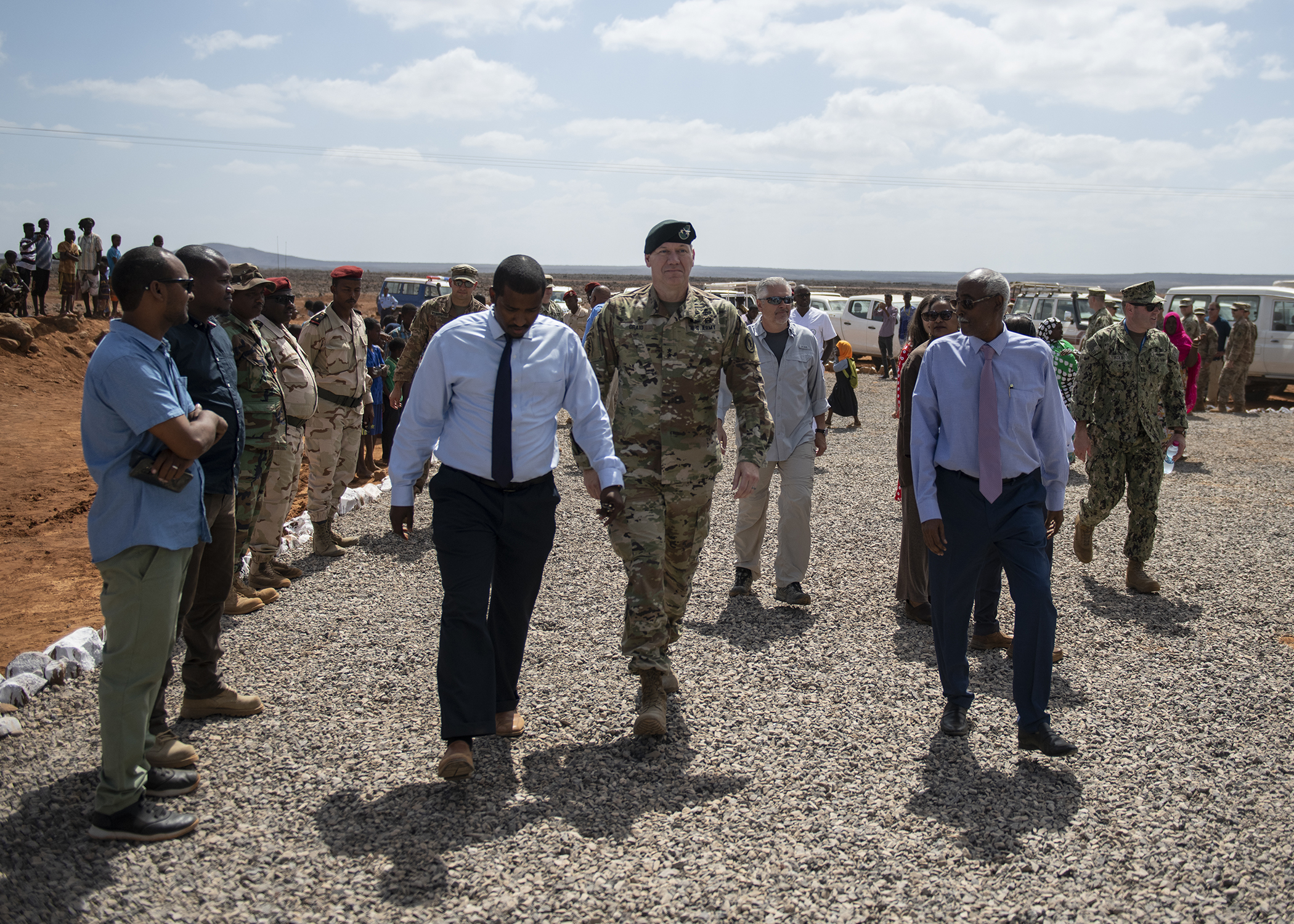 U.S. Army Maj. Gen. James D. Craig, commanding general, Combined Joint Task Force-Horn of Africa (CJTF-HOA), walks with Djiboutian government officials during the Ali Oune Medial Clinic ribbon cutting ceremony in Ali Oune, Djibouti, Jan. 31, 2019. The clinic, which U.S. Navy Seabees from Naval Mobile Construction Battalion 1, assigned to CJTF-HOA, have been working to complete for five months, is intended to enhance the Ministry of Health for Djibouti’s ability to provide basic medical, birth and after care to the Ali Oune village and its more than 1,000 residents and rural neighbors. (U.S. Air Force photo by Tech. Sgt. Shawn Nickel)