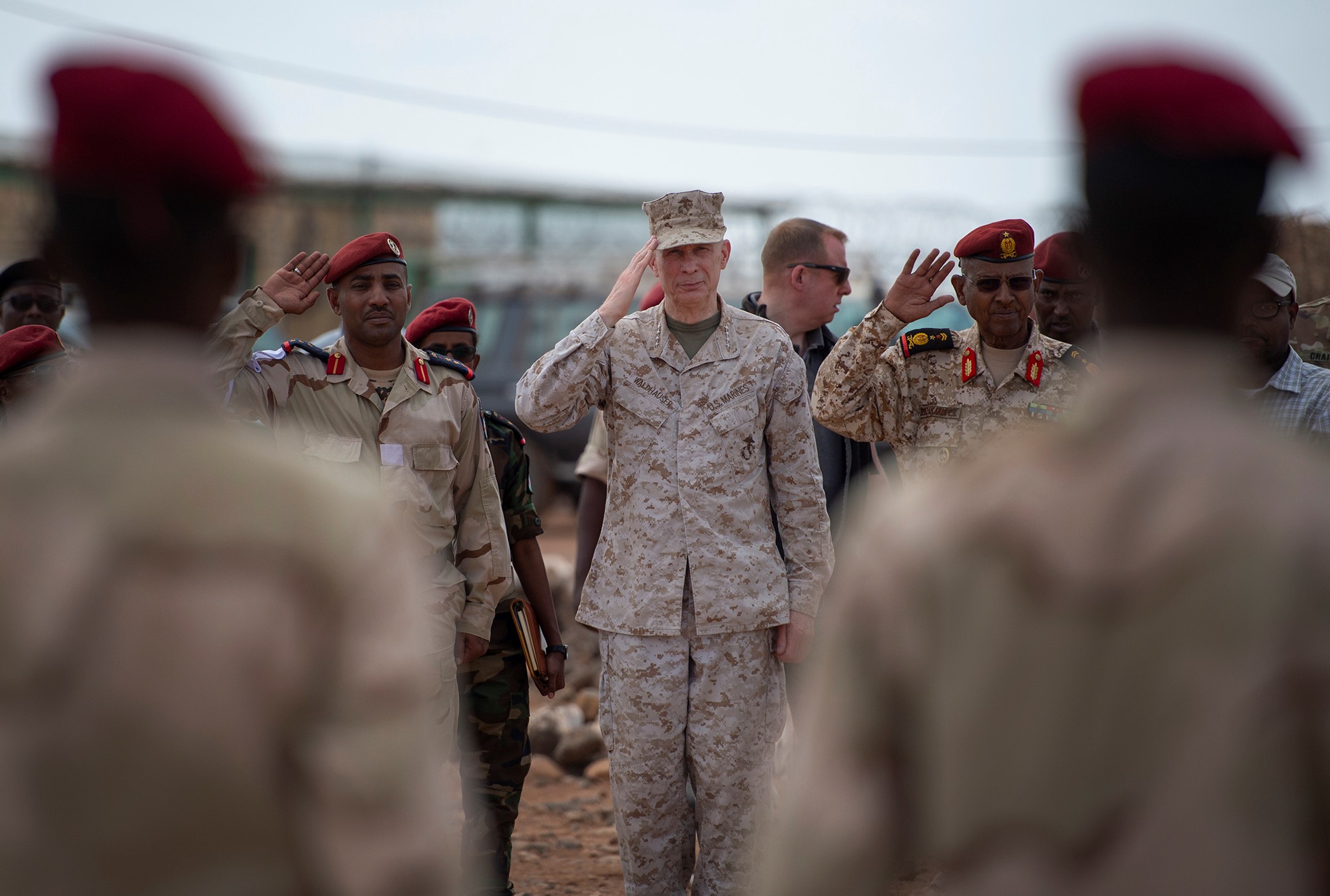 U.S. Marine Corps Gen. Thomas D. Waldhauser, commander of U.S. Africa Command, salutes prior to a demonstration by soldiers from the Djiboutian army’s elite military force, the Rapid Intervention Battalion, during a visit with senior Djiboutian officials, including Chief of General Staff of the Djibouti Armed Forces Gen. Zakaria Cheikh Ibrahim, at a training base in Djibouti, March 21, 2019. Waldhauser visited in order to discuss the growth and development of Djiboutian security forces. (U.S. Air Force photo by Tech. Sgt. Shawn Nickel)