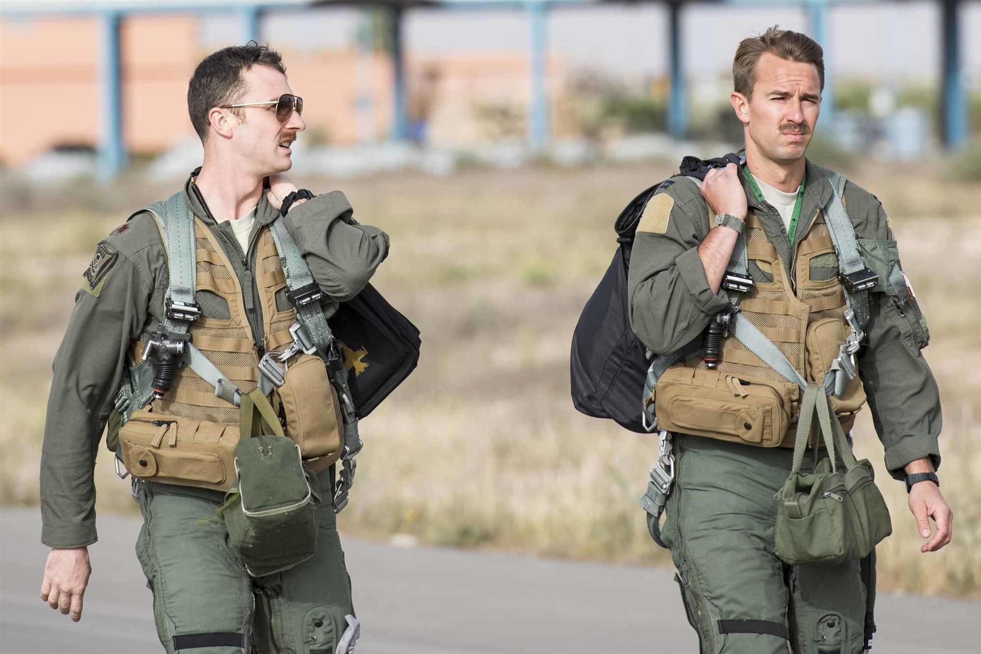 Two F-16C Fighting Falcon pilots from the 555th Expeditionary Fighter Squadron walk on a flight line during exercise African Lion 2019 at Ben Guerir Air Base, Morocco, March 25, 2019. The multi-lateral exercise was designed to improve interoperability and mutual understanding of each nations’ tactics. African Lion 2019 is a Chairman of the Joint Chiefs of Staff-sponsored, U.S. Africa Command-scheduled, U.S. Marine Corps Forces Europe and Africa-led, joint and combined exercise conducted in the Kingdom of Morocco with a spoke in Tunisia, and armed forces participants in from Canada, France, Senegal, Spain, and the United Kingdom. (U.S. Air Force photo by Staff Sgt. Ceaira Tinsley)