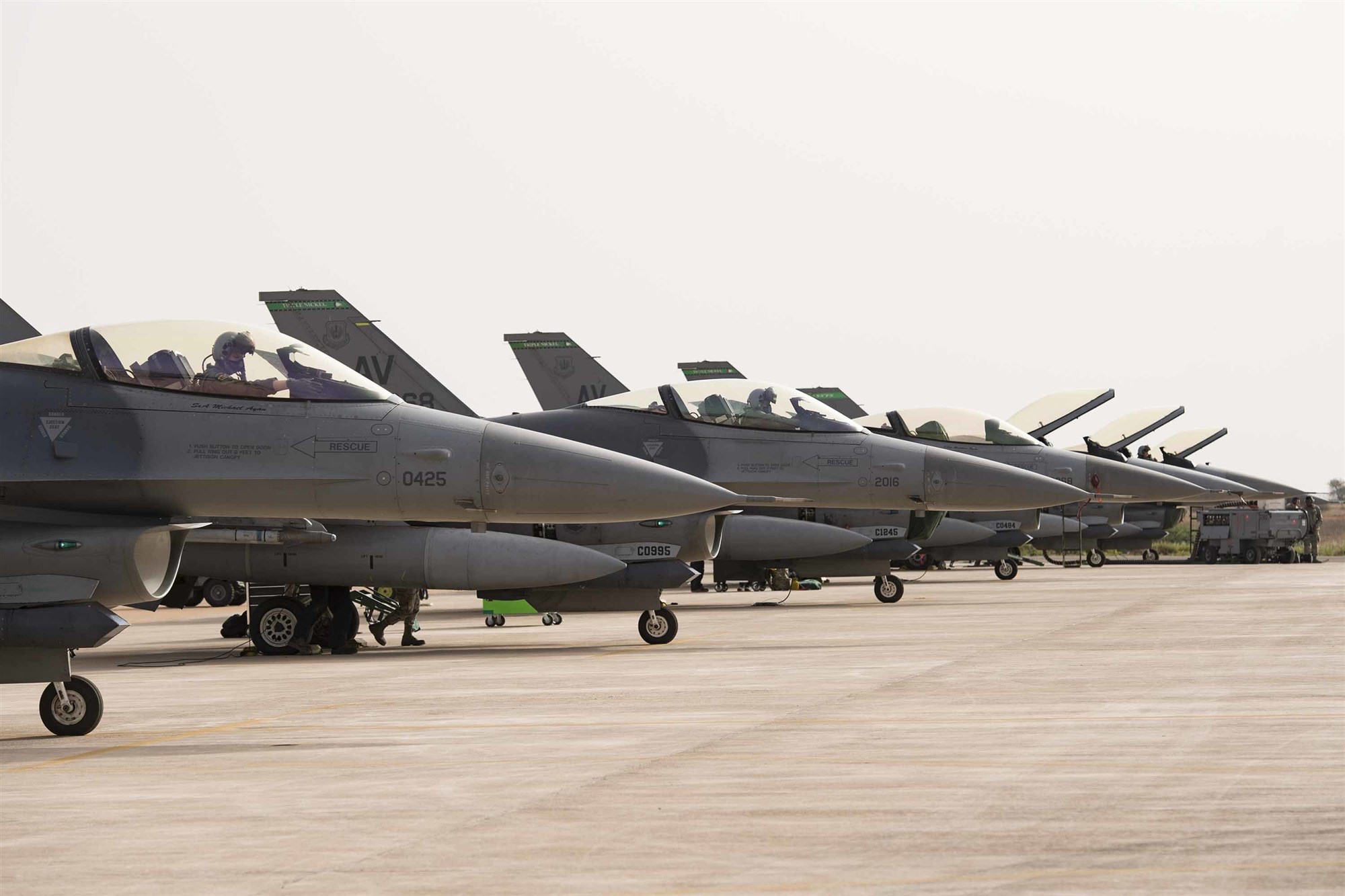 Four F-16C Fighting Falcons from the 555th Expeditionary Fighter Squadron taxi during exercise African Lion 2019 at Ben Guerir Air Base, Morocco, March 25, 2019. African Lion 2019 is a Chairman of the Joint Chiefs of Staff-sponsored, U.S. Africa Command-scheduled, U.S. Marine Corps Forces Europe and Africa-led, joint and combined exercise conducted in the Kingdom of Morocco with a spoke in Tunisia, and armed forces participants in from Canada, France, Senegal, Spain, and the United Kingdom. (U.S. Air Force photo by Staff Sgt. Ceaira Tinsley)