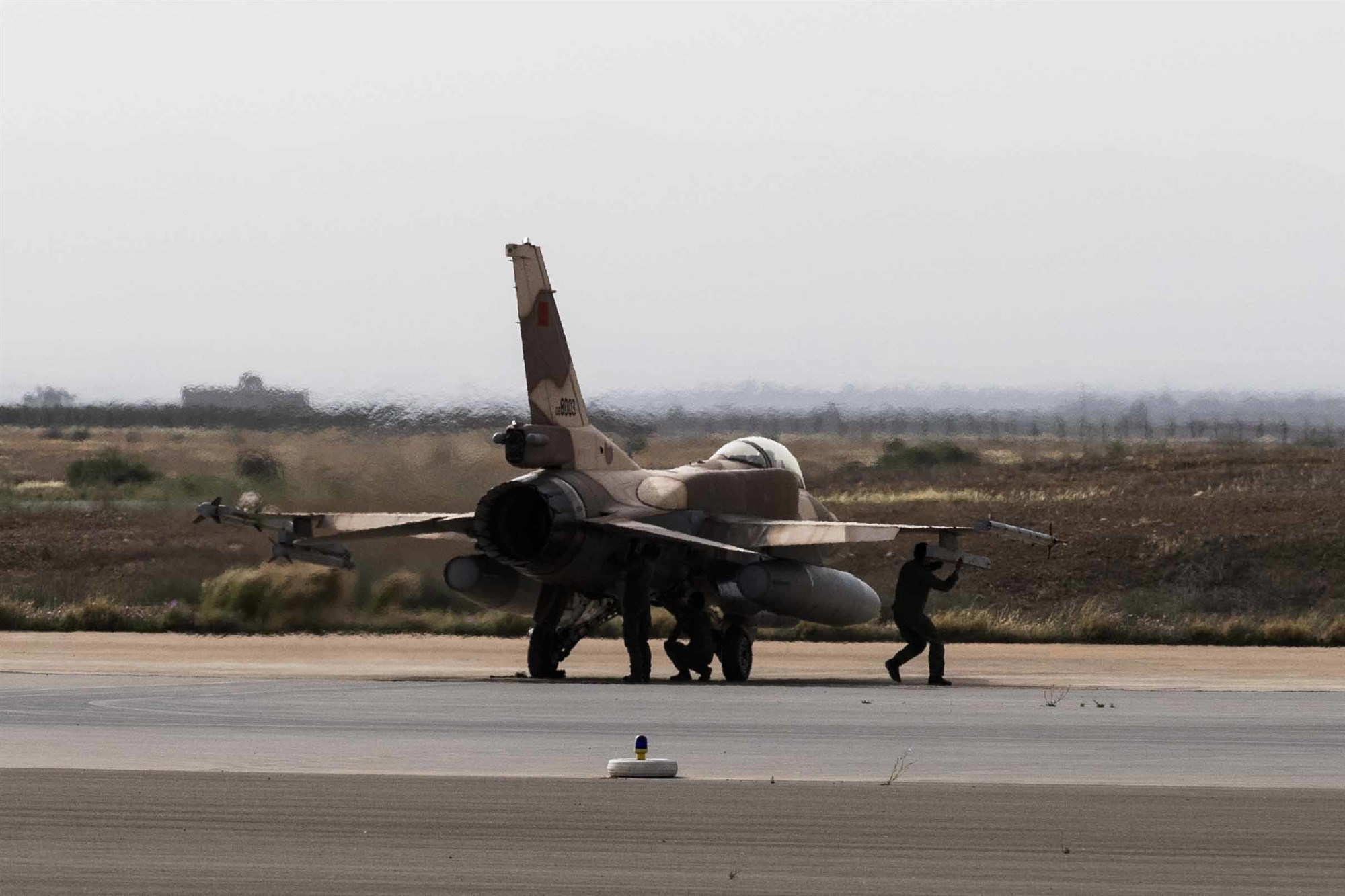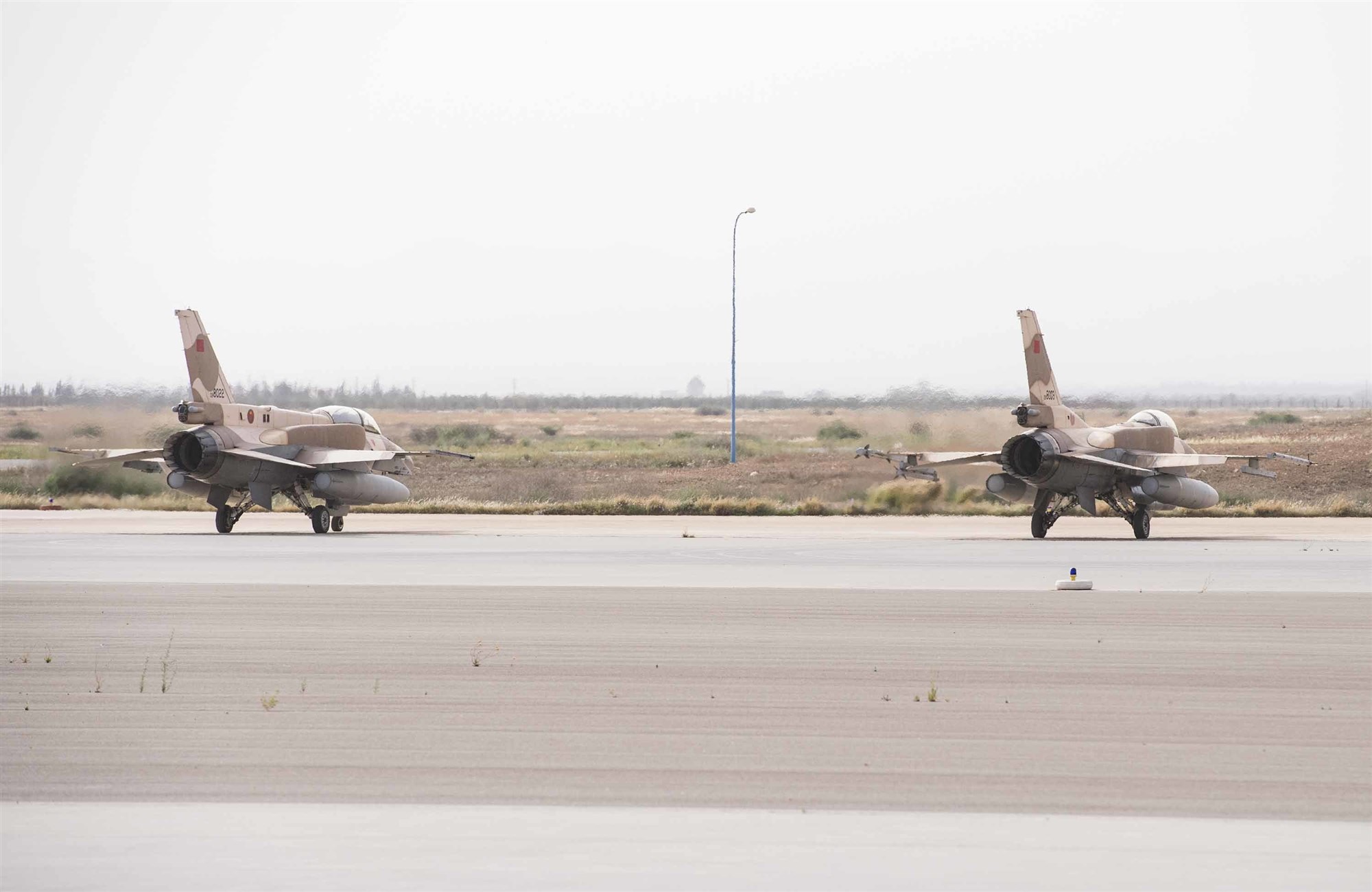 Two Royal Moroccan Air Force F-16s rests on the flight line during exercise African Lion 2019 at Ben Guerir Air Base, Morocco, March 25, 2019. The exercise allowed Moroccan and U.S. F-16s to train together on the tactics, techniques and procedures necessary in a real-world scenario to counter-violent extremist organizations. African Lion 2019 is a Chairman of the Joint Chiefs of Staff-sponsored, U.S. Africa Command-scheduled, U.S. Marine Corps Forces Europe and Africa-led, joint and combined exercise conducted in the Kingdom of Morocco with a spoke in Tunisia, and armed forces participants in from Canada, France, Senegal, Spain, and the United Kingdom. (U.S. Air Force photo by Staff Sgt. Ceaira Tinsley)