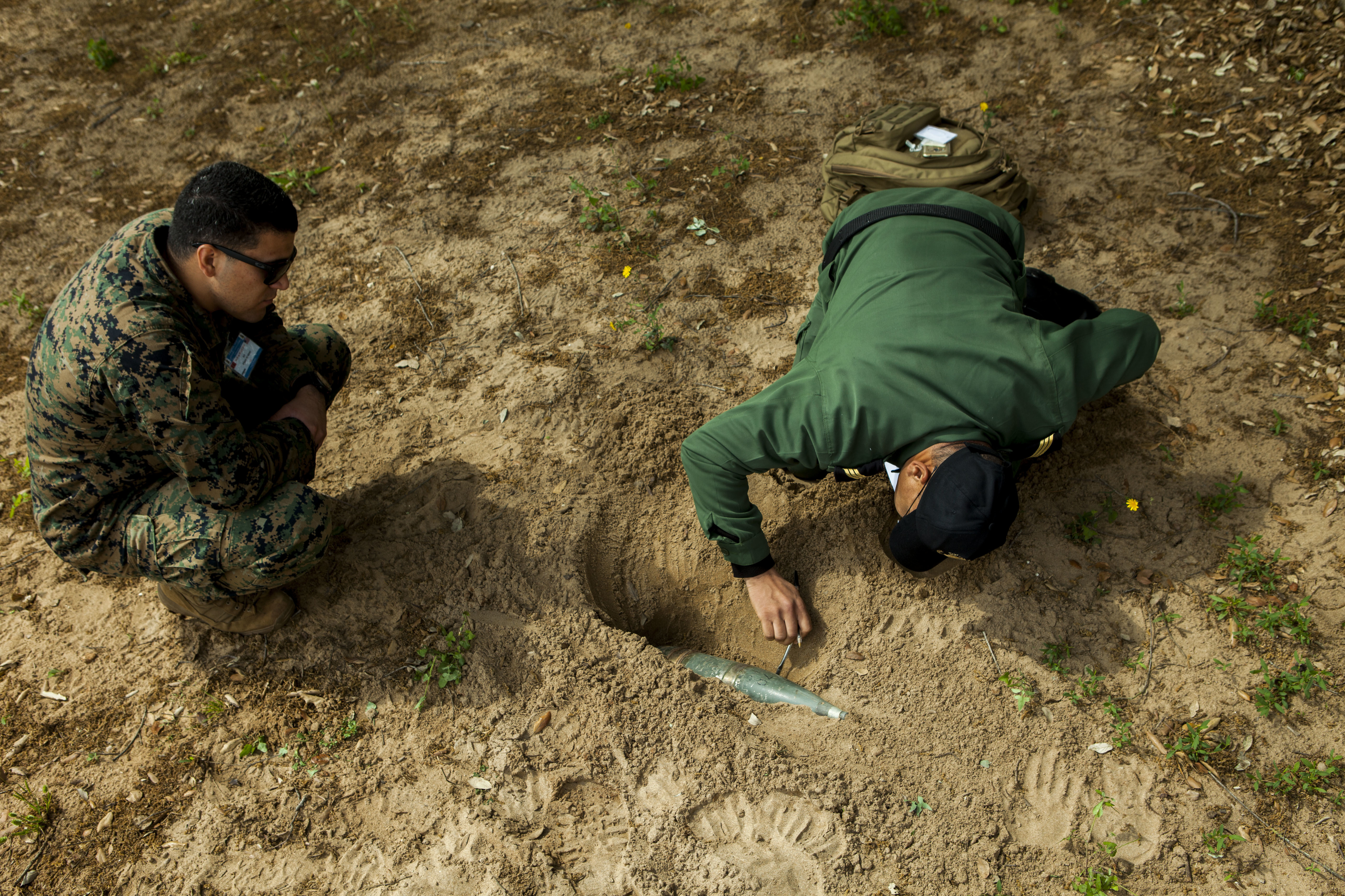 During the scenarios, the students would go downrange with their gear, conduct reconnaissance on the inert explosives, and take measurements and pictures in order to get a good understanding of the type of ordnance they were dealing with. After the students executed reconnaissance of the inert items, they returned to the classroom to reference their learning material in order to identify the type of ordnance they were dealing with. The students would then rehearse procedures to dispose of the item.