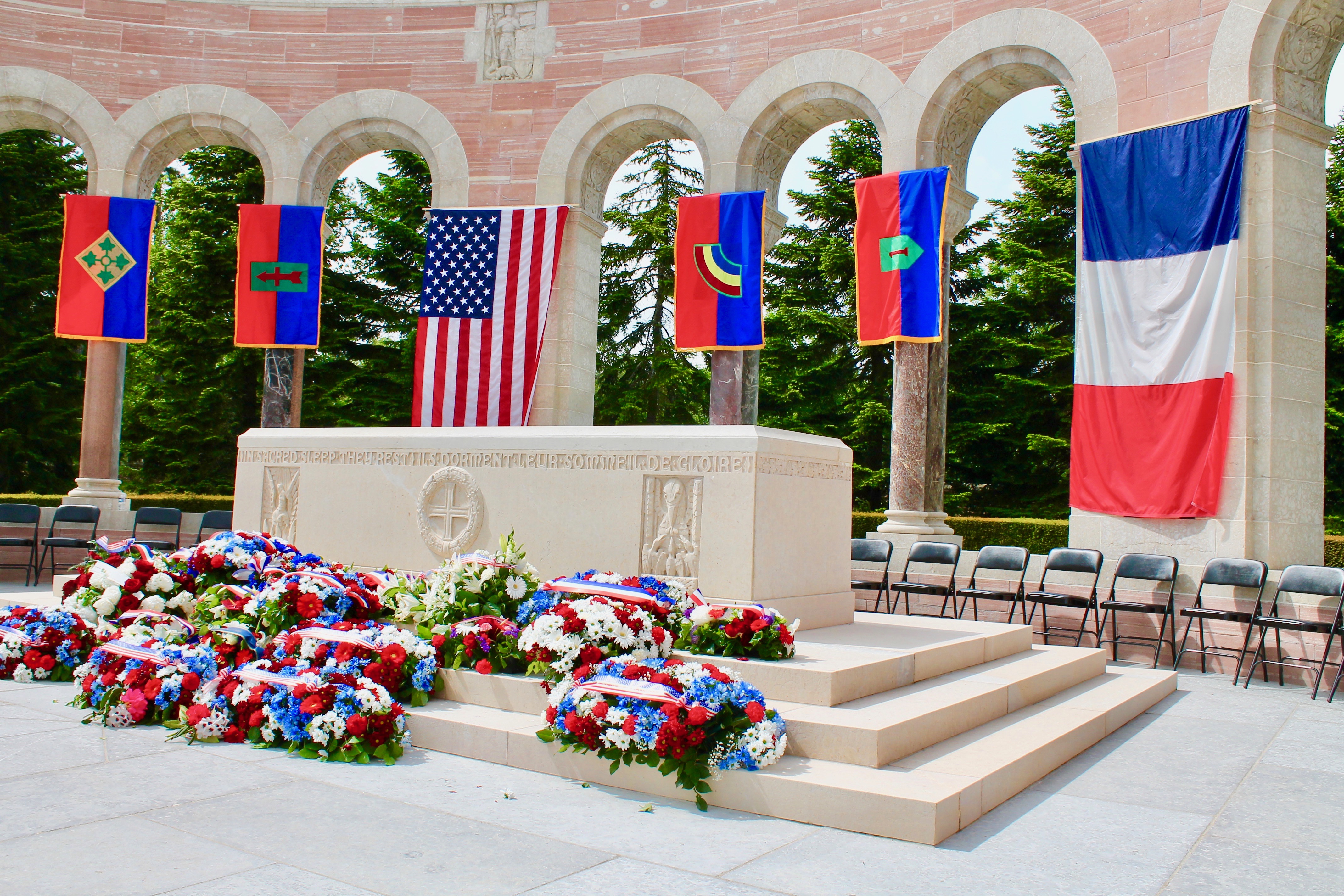 The memorial alter showcases 10 flags the signify the insignia of the ten American divisions (1st, 2d, 3d, 4th, 26th, 28th, 32d, 42d, 77th, and 93d Divisions) which fought in this sector during the 1918 Oise-Aisne Offensive.
