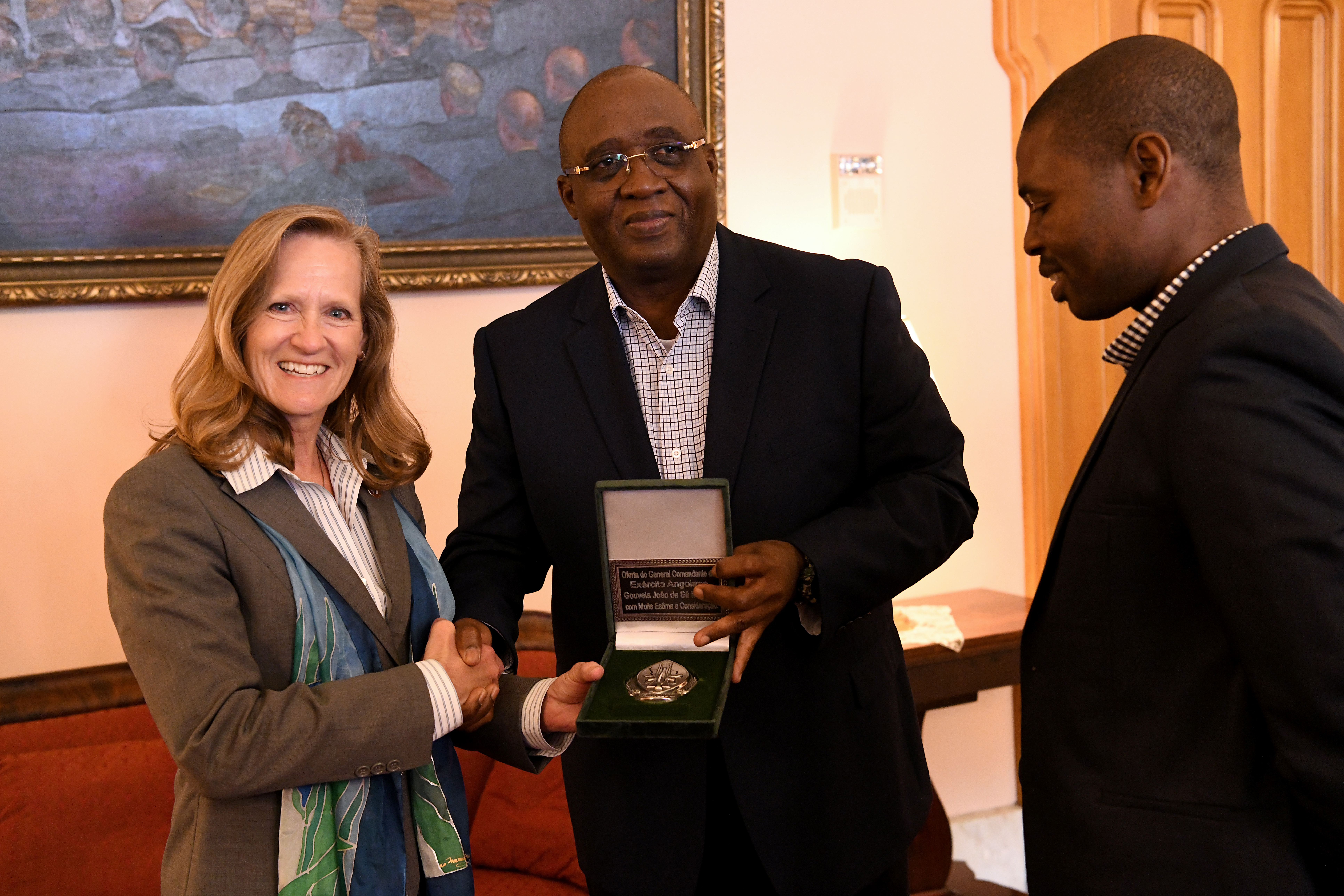 Retired Maj. Gen. Deborah Ashenhurst (left), director of the Ohio Department of Veterans Services, shakes hands with Gen. Jaques Raul (center), the deputy land forces commander of the Angolan Armed Forces, during a gift exchange June 4, 2019, at the Ohio Statehouse in Columbus, Ohio. Ashenhurst gave Raul a customized, mounted Ohio license plate with his name on it.