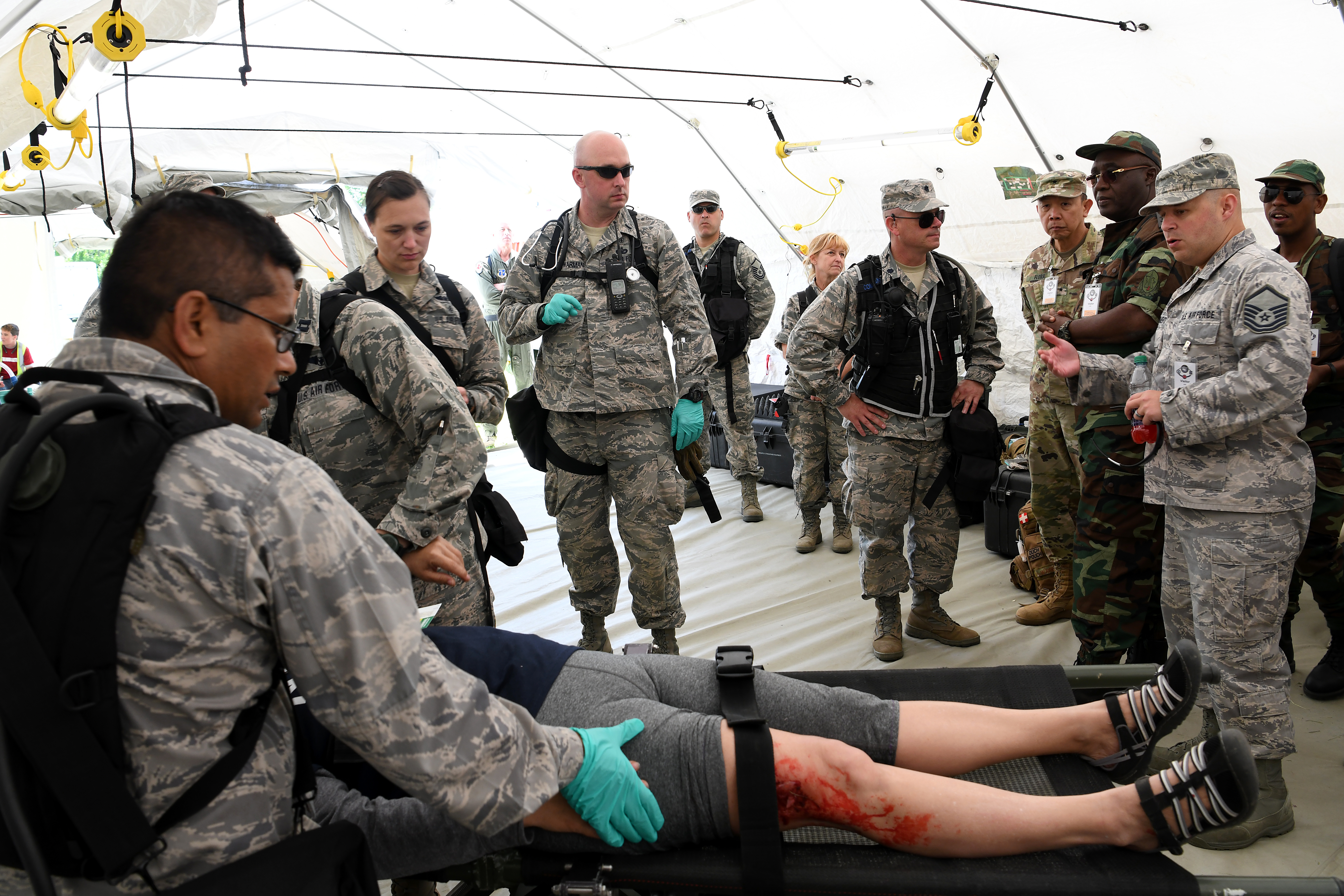 U.S. Air Force Master Sgt. Marcos Nascimento (right), a public health noncommissioned officer in charge assigned to the 111th Attack Wing, translates for an Angolan Armed Forces delegation observing treatment of a simulated medical causality during an Ohio National Guard Homeland Response Force nuclear explosion exercise June 3, 2019, at Camp James A. Garfield Joint Military Training Center near Newton Falls, Ohio. The purpose of the Angolan delegation’s visit to Ohio was to build U.S.-Angola defense relations and gain an overview National Guard defense capabilities.