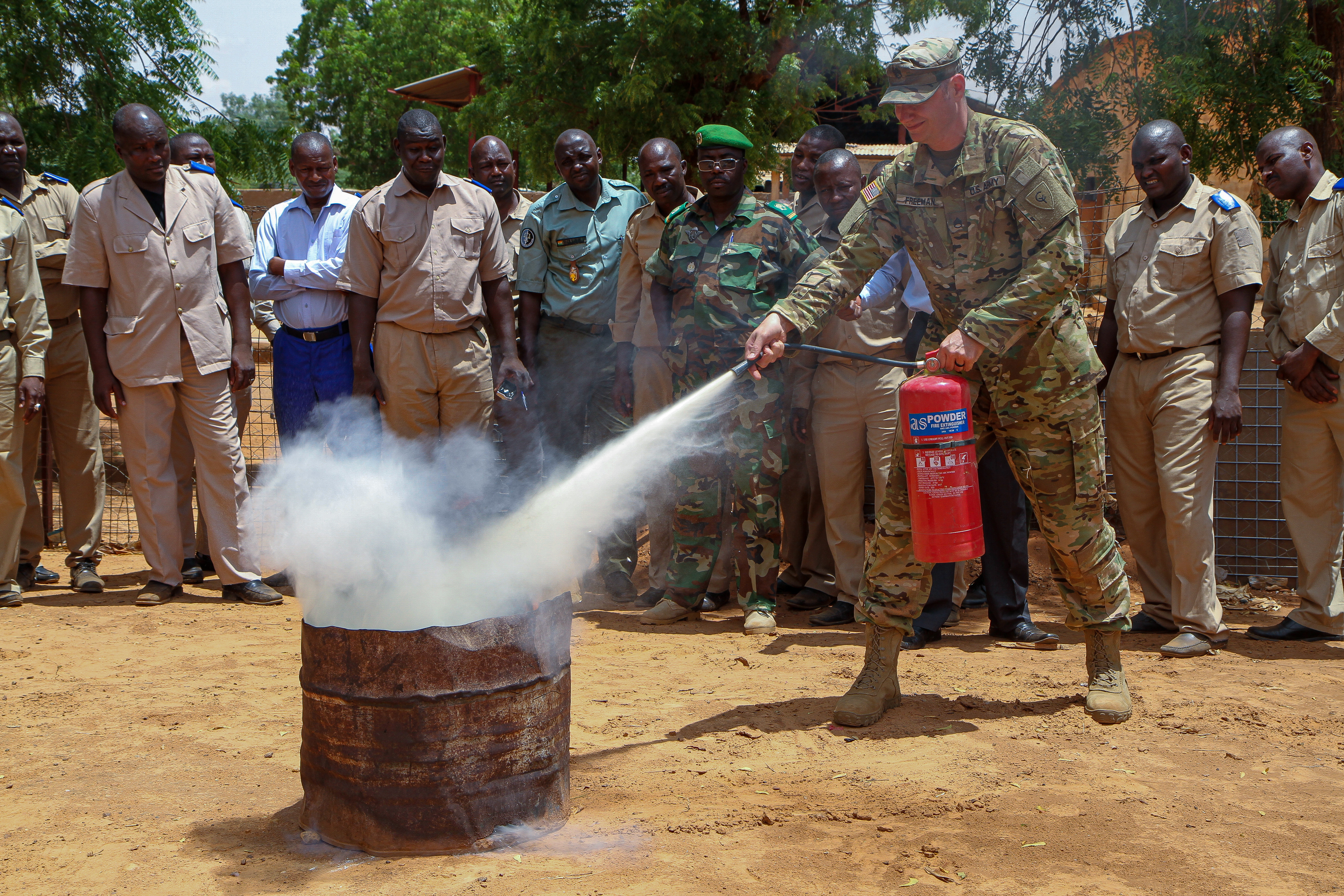 Indiana National Guard Staff Sgt. Cody Freeman, a grounds fuel operations specialist, demonstrates the proper technique for putting out a gas fire with a fire extinguisher during the site visit component of Operation Hydrocarbon June 12, 2019 at Camp Badage, Niger. The operation was a five-day exercise with a goal of exchanging tactic, procedures, and techniques for fuel, logistical, and maintenance operations.
