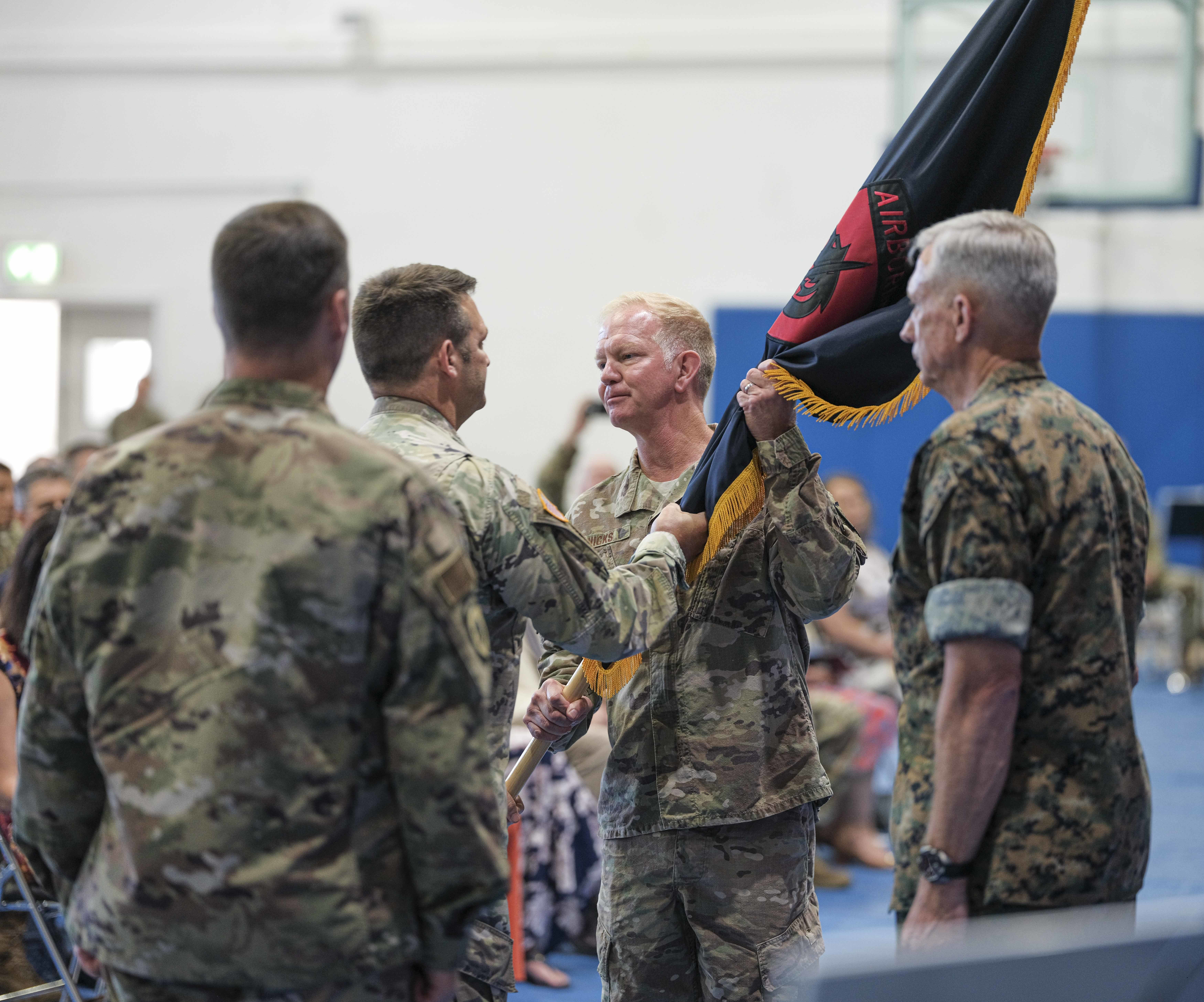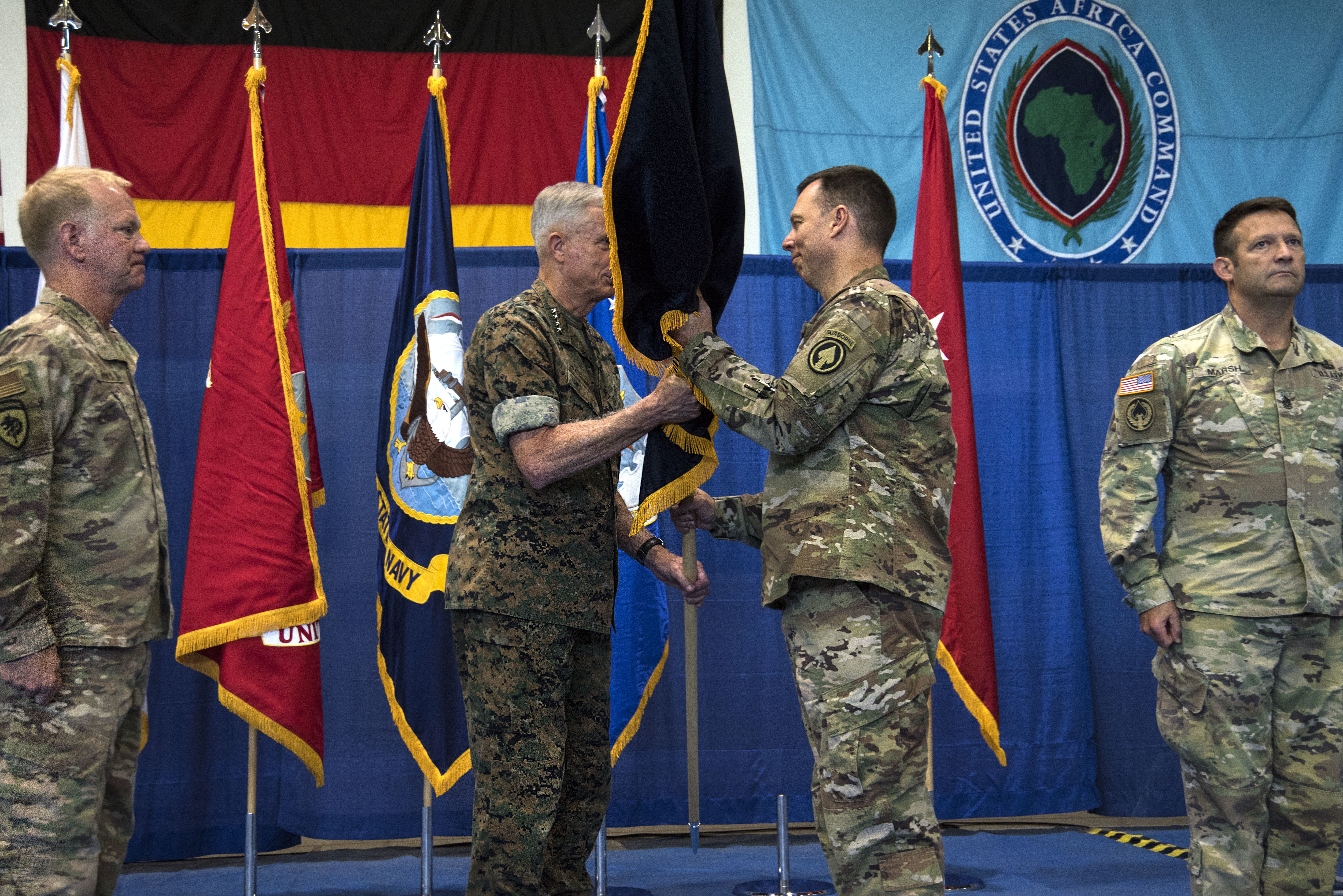 U.S. Marine Corps Gen. Thomas D. Waldhauser, commander of U.S. Africa Command, hands the Special Operations Command Africa guidon to incoming SOCAFRICA commander U.S. Air Force Brig. Gen. Dagvin R.M. Anderson during a change of command ceremony at Kelley Barracks, Stuttgart, Germany, June 28, 2019. Special Operations Command Africa supports U.S. Africa Command by counter violent extremist organizations, building the military capacity of key partners in Africa and protecting U.S. personnel and facilities. (U.S. Navy photo by Mass Communication Specialist 1st Class Christopher Hurd/Released)