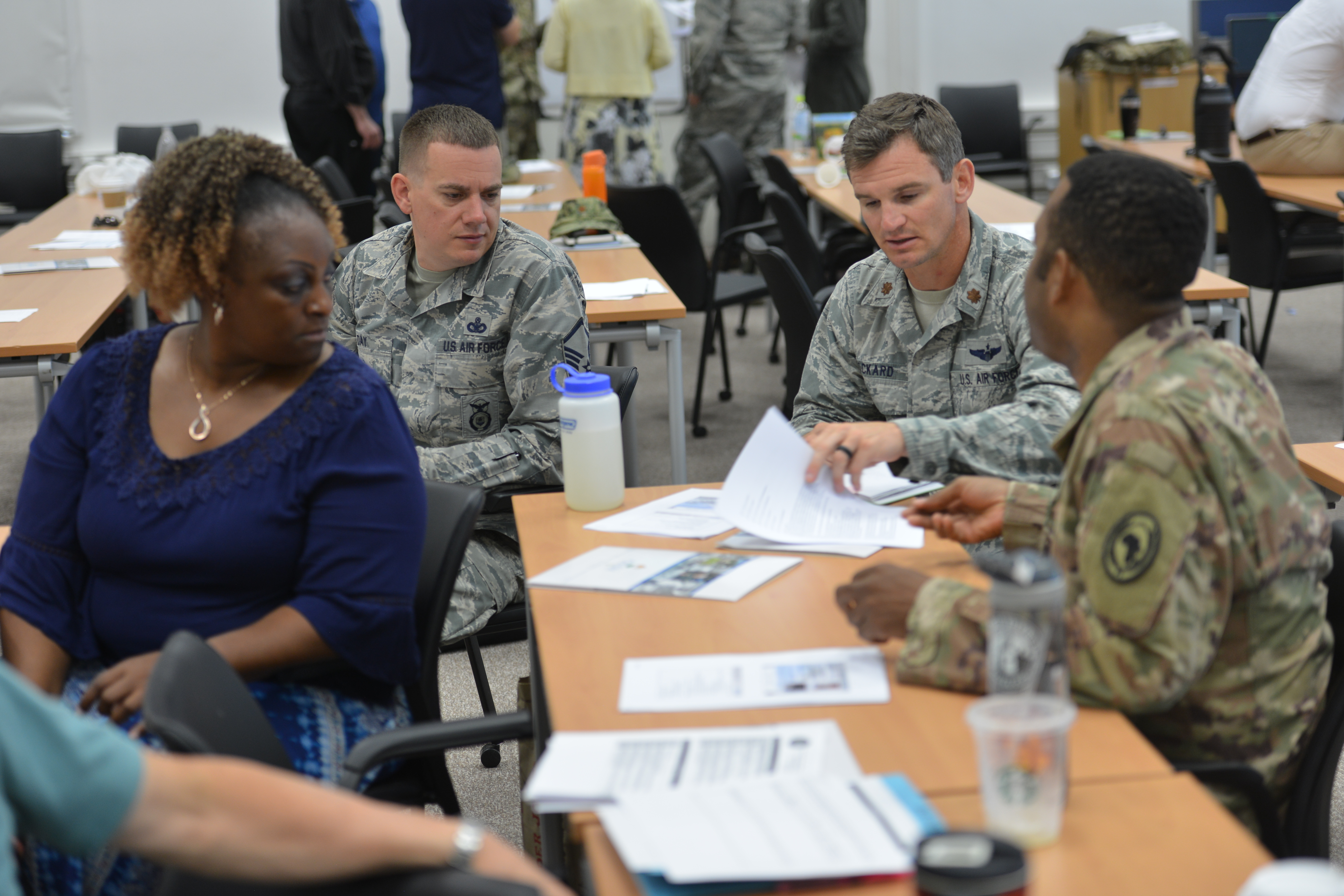 STUTTGART, Germany—Staff members from U.S. Africa Command work as a team to complete a group assignment on humanitarian assistance and disaster relief response at the Humanitarian Assistance Response Training Course, June 26, 2019, at the Kelley Special Events Center, Stuttgart, Germany. AFRICOM held the HART event June 25-28, 2019, to train AFRICOM staff members on humanitarian assistance and disaster relief response. (Photo by Staff Sgt. Grady Jones, Public Affairs, AFRICOM)