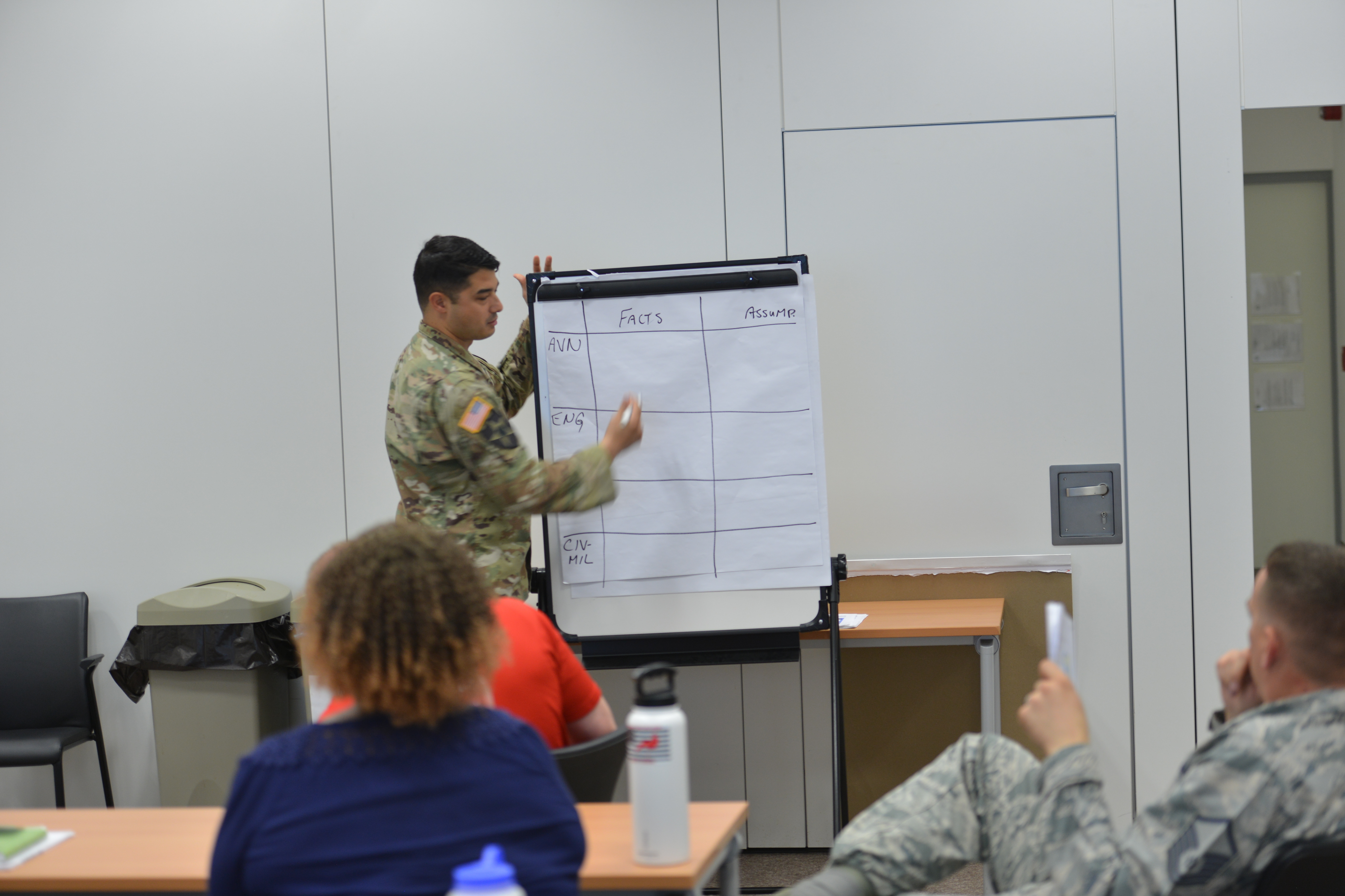 STUTTGART, Germany—Cpt. Jason DiDomenco, Humanitarian Assistance Program Manager, Directorate of Strategic Plans and Policy J5, U.S. Africa Command, leads a small group during a practical exercise at the Humanitarian Assistance Response Training Course, at the Kelley Special Events Center, Stuttgart, Germany, June 28, 2019. AFRICOM held the HART event June 25-28, 2019, to train AFRICOM staff members on humanitarian assistance and disaster relief response. (Photo by Staff Sgt. Grady Jones, Public Affairs, AFRICOM)