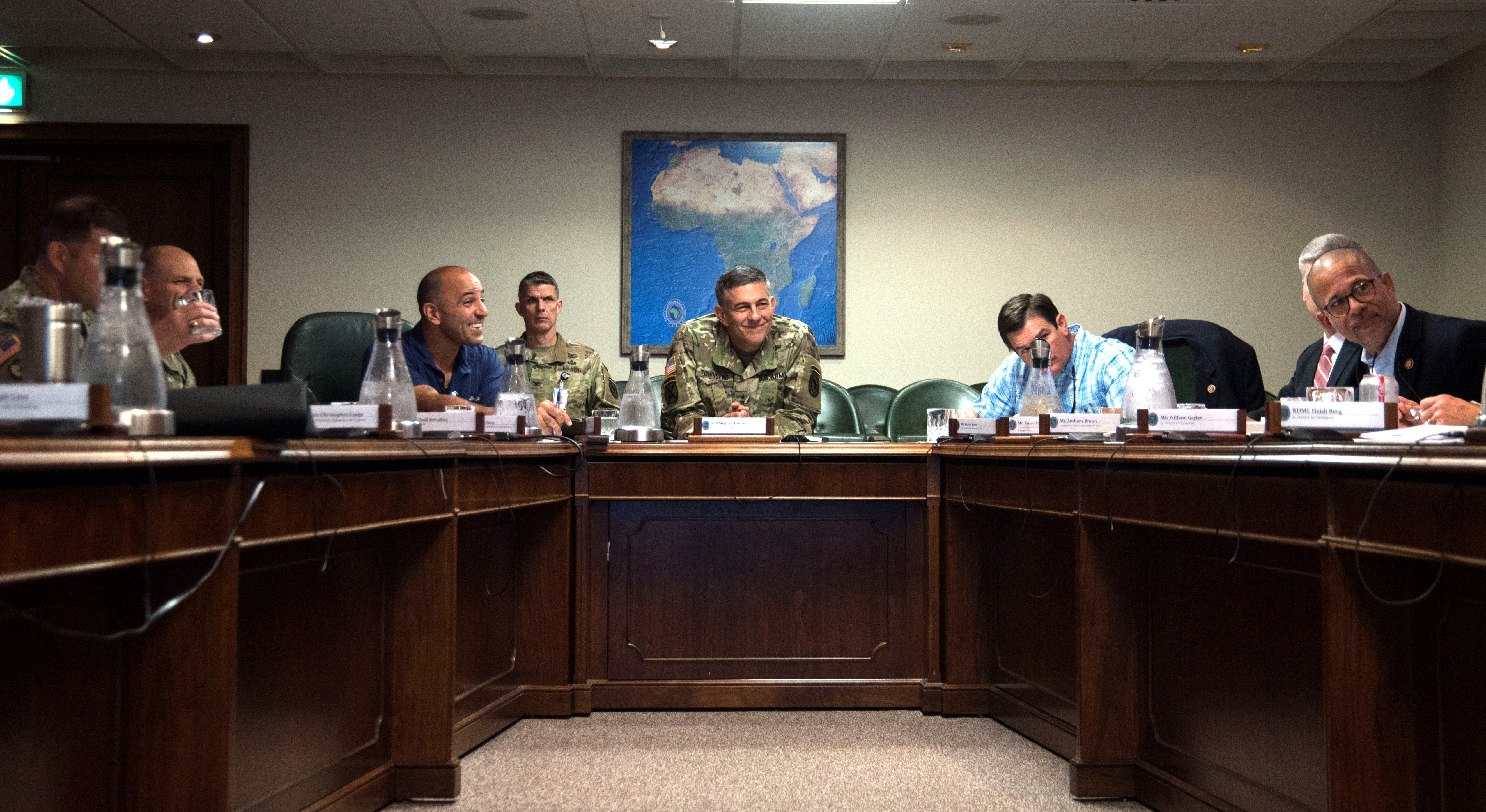 U.S. Army Gen. Stephen J. Townsend, commander, U.S. Africa Command, and AFRICOM senior leaders meet with a congressional delegation Aug. 23, 2019. The visit was to gain insight about how the command’s operations and activities support the U.S. strategy for Africa. (U.S. Navy photo by Mass Communication Specialist 1st Class Christopher Hurd/Released)