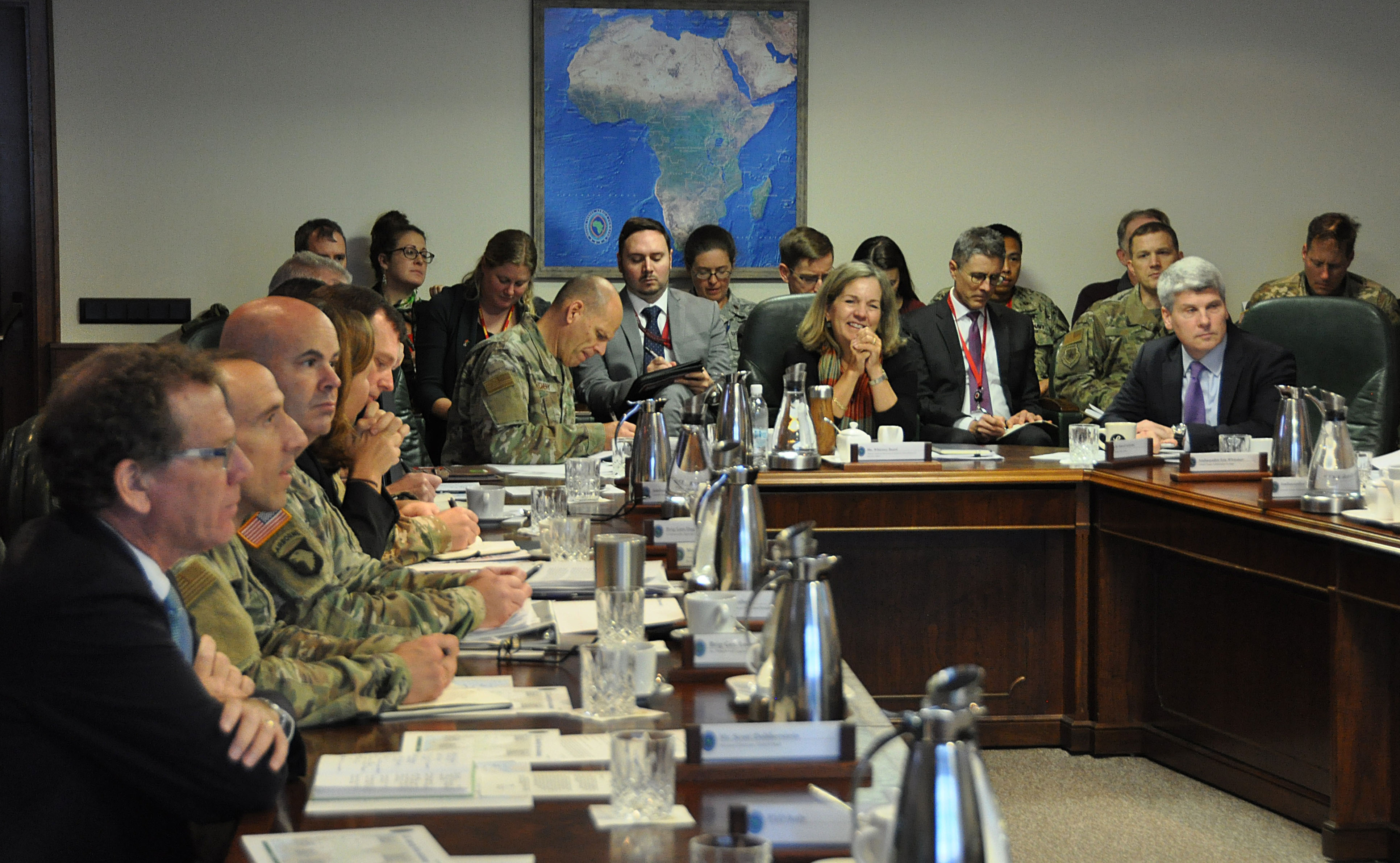 Whitney Baird (center), Deputy Assistant Secretary of State for West Africa and Security Affairs in the Bureau of African Affairs, U.S. Africa Command leadership and U.S. Ambassadors to Burkina Faso, Mali, Mauritania, Niger, and a representative from the Office of Security Cooperation in Chad, participated in discussions about the Sahel region of Africa, in Stuttgart, Germany Oct. 8, 2019. Foreign Liaison Officers from Germany, France, Italy, Spain and the United Kingdom also participated in the talks which were aimed at creating a shared vision of the way forward among the Sahel countries. (U.S. Air Force photo by Master Sgt. Megan Crusher)