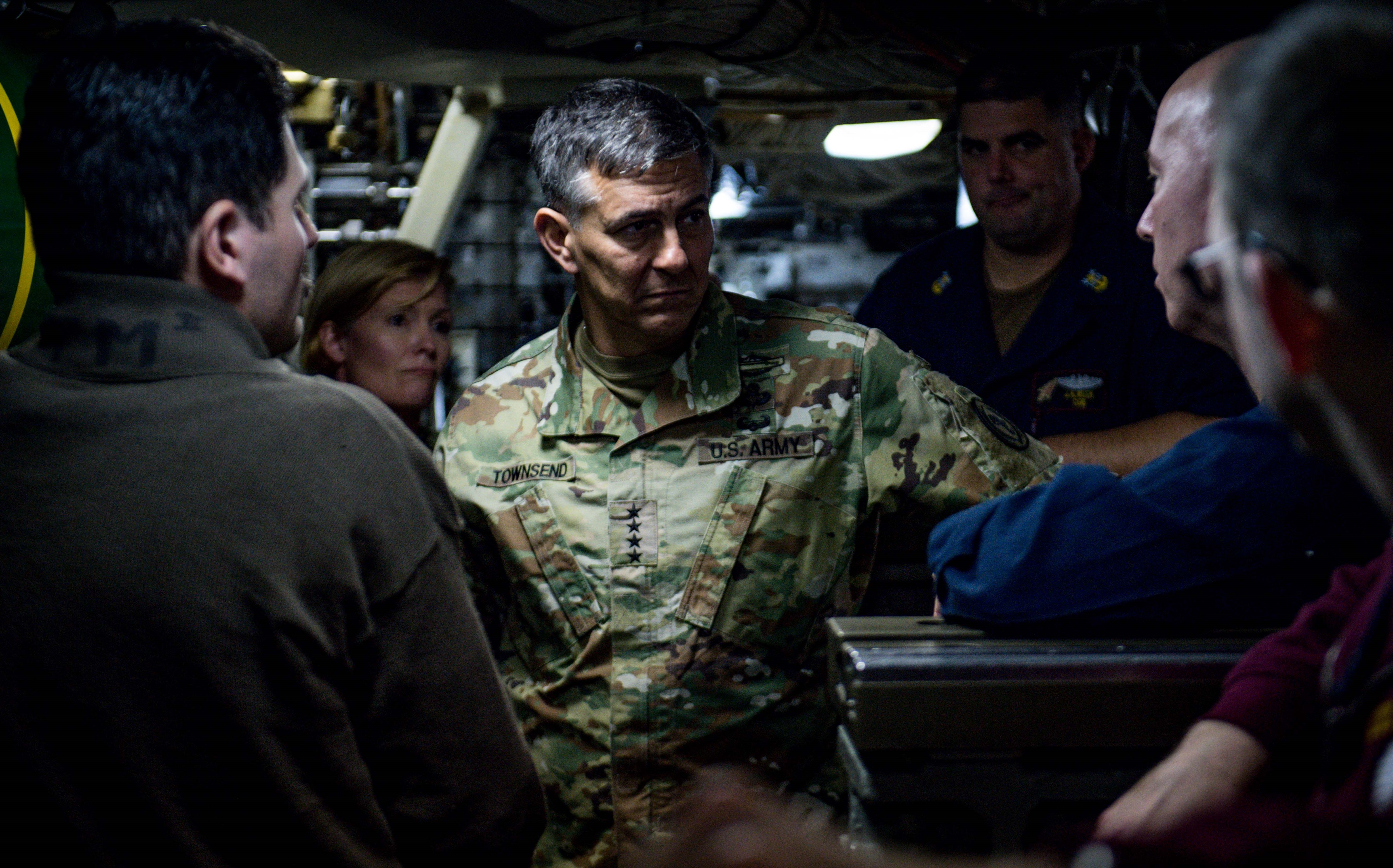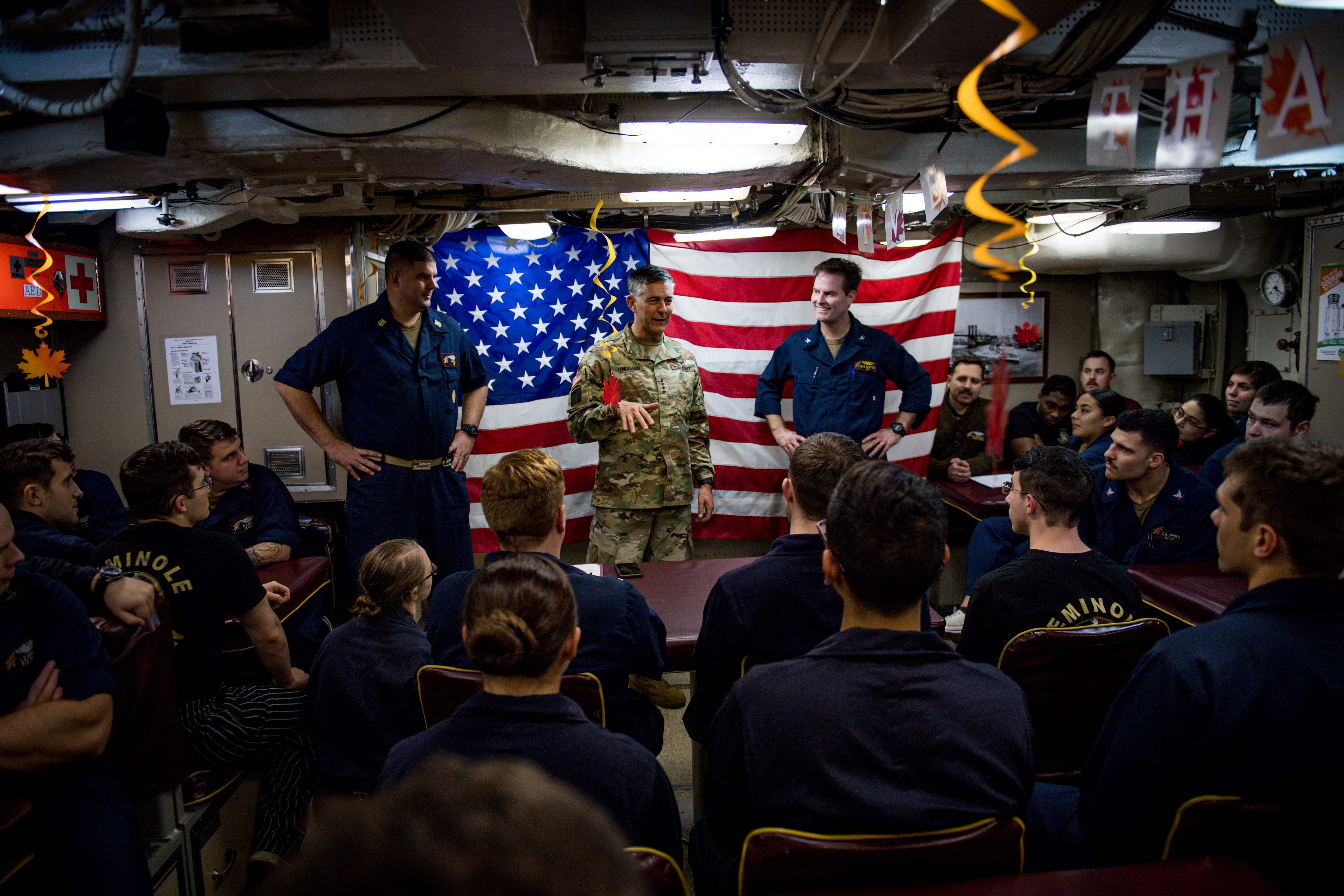U.S. Army Gen. Stephen J. Townsend, commander, U.S. Africa Command (AFRICOM), center, speaks with the crew of the Ohio-class fleet guided-missile submarine USS Florida (SSGN 728) while underway in the Mediterranean Sea Nov. 25, 2019. AFRICOM, a full-spectrum combatant command, is one of the six U.S. Defense Department's geographic combatant commands and is responsible for all DoD operations, exercises, and security cooperation on the African continent, its island nations, and surrounding waters. (U.S. Navy photo by Mass Communication Specialist 2nd Class Jonathan Nelson)