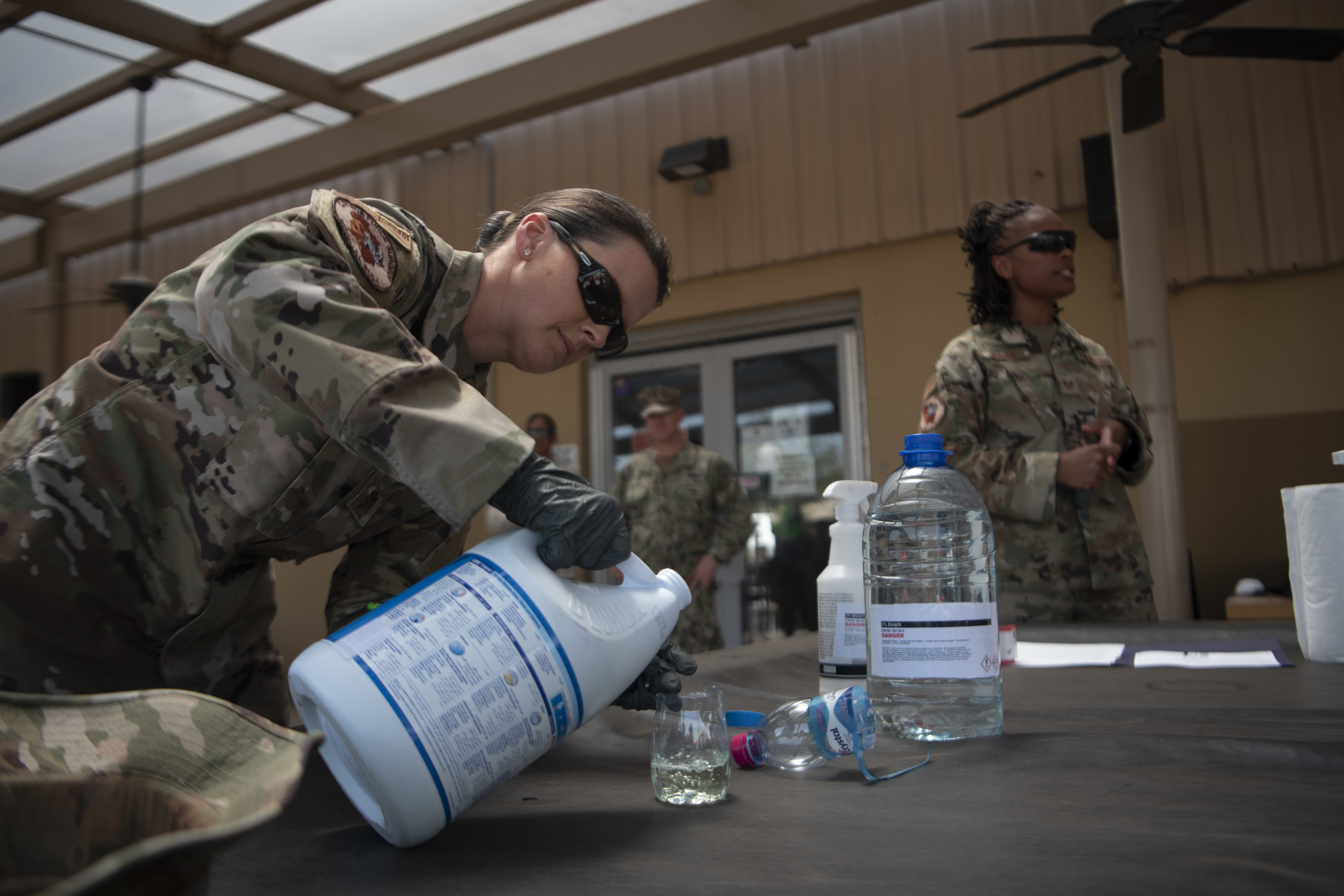 “The team was taught how germs, such as viruses, can live on non-porous surfaces, such as metal, glass, plastic, and laminated surfaces, for up to several days,” said U.S. Air Force Maj. Leah Chapman, CJTF-HOA Surgeon Cell public health officer. “They were also taught the importance of cleaning and wiping down all such surfaces and objects, how to mix a bleach cleaning solution and how to apply it in the varying common use locations and the use of proper personal protective equipment for the job.”