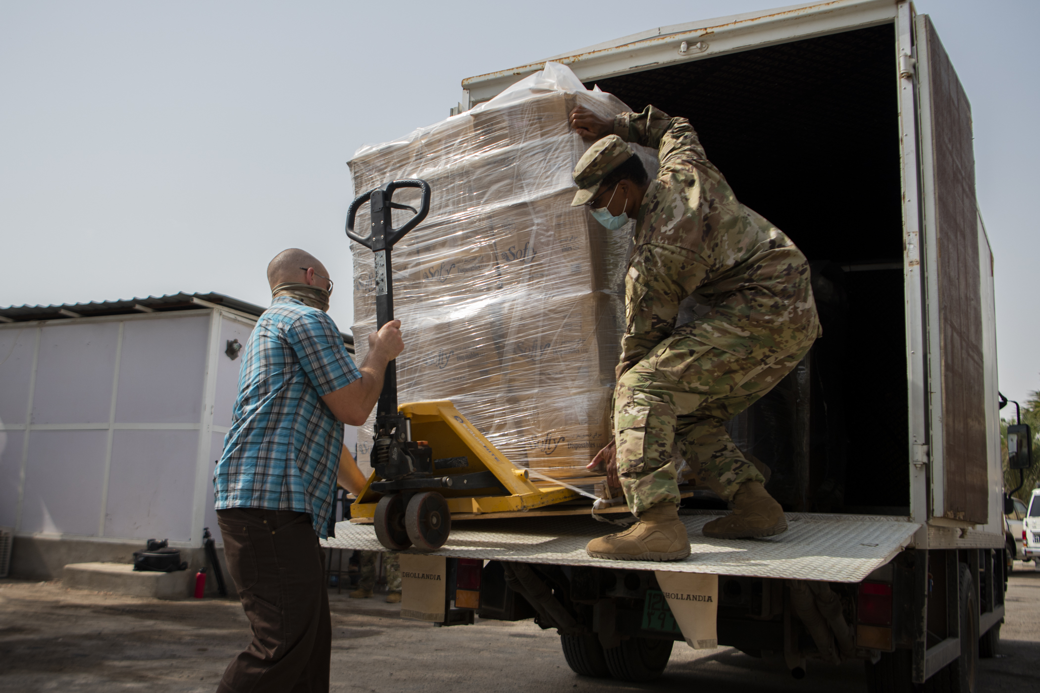 U.S. Army Maj. Jonathan Holliday (left), bilateral affairs officer, U.S. Embassy to Djibouti, and U.S. Army Staff Sgt. Mackenzie Vilme (right), team sergeant, Alpha Company, 443rd Civil Affairs Battalion (CA BN), Combined Joint Task Force-Horn of Africa (CJTF-HOA), unload hygiene supplies to assist Djibouti prevent COVID-19 infections among hospital staff and its citizens at Djibouti City, Djibouti, June 10, 2020. CJTF-HOA worked to purchase the supplies, valued at approximately $15,000, using Overseas Humanitarian, Disaster, and Civic Aid Appropriation (OHDACA) funds after the Djibouti government made a formal request for assistance to the U.S. Embassy.