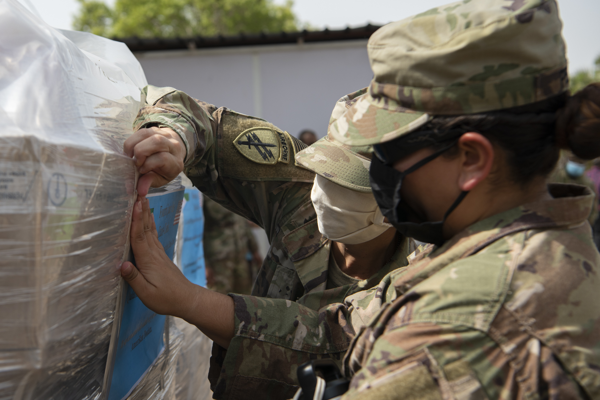 U.S. Army Capt. Dawn Carter (left), team chief, Alpha Company, 443rd Civil Affairs Battalion (CA BN), Combined Joint Task Force-Horn of Africa (CJTF-HOA), and U.S. Army Sgt. Alexis Peine (right), team medic, 443rd CA BN, label hygiene supplies to assist Djibouti prevent COVID-19 infections among hospital staff and its citizens at Djibouti City, Djibouti, June 10, 2020. CJTF-HOA worked to purchase the supplies, valued at approximately $15,000, using Overseas Humanitarian, Disaster, and Civic Aid Appropriation (OHDACA) funds after the Djibouti government made a formal request for assistance to the U.S. Embassy.