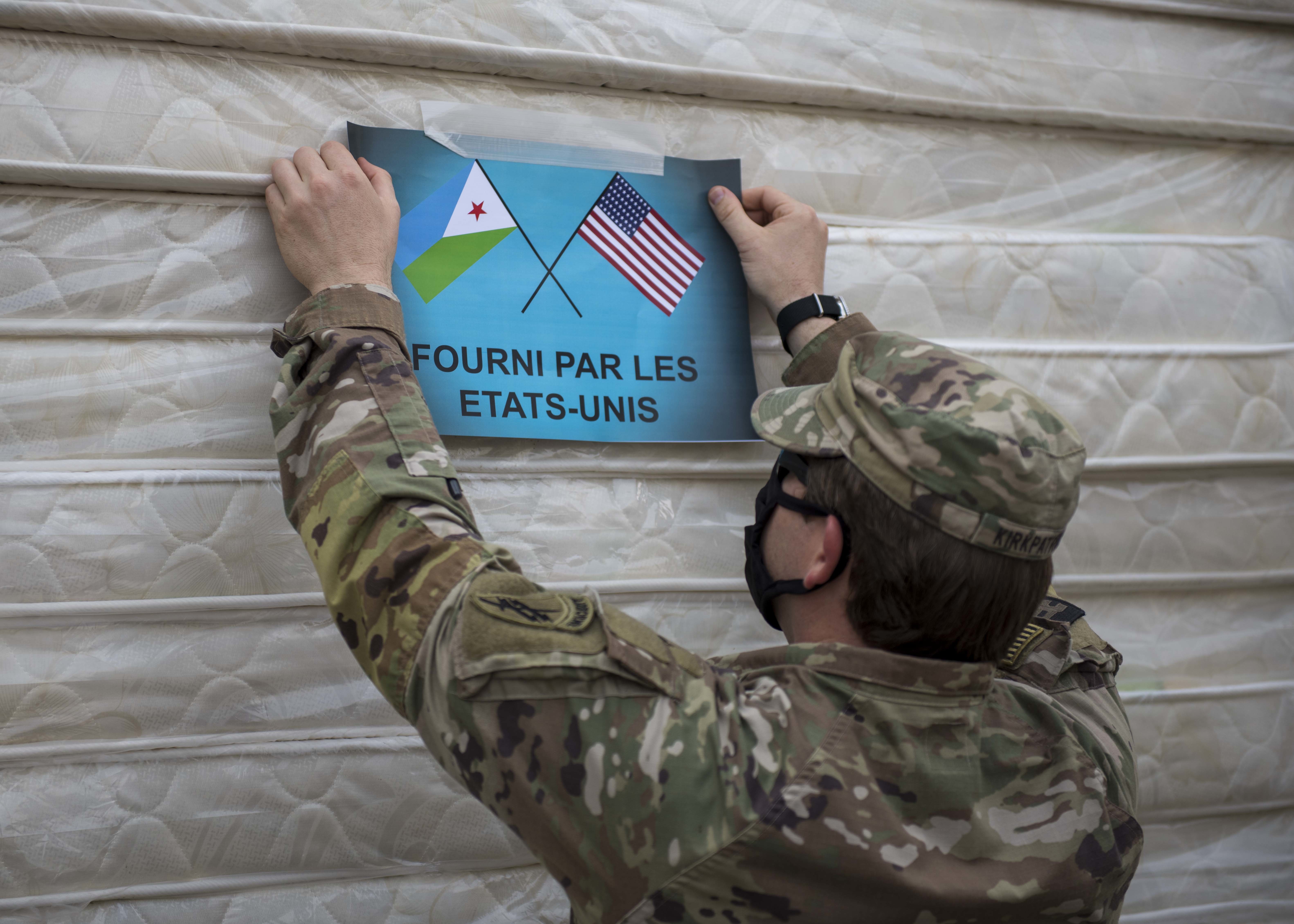 U.S. Army Capt. Matthew Kirkpatrick, team chief, 411th Civil Affairs Battalion, Combined Joint Task Force-Horn of Africa (CJTF-HOA, posts a notice that reads, “Provided by the United States” prior to a ceremony at Bouffard Hospital in Djibouti City, Djibouti, June 25, 2020. CJTF-HOA donated 60 beds valued at $9,400 to the Djiboutian Ministry of Health for its efforts during the ongoing COVID-19 pandemic.
