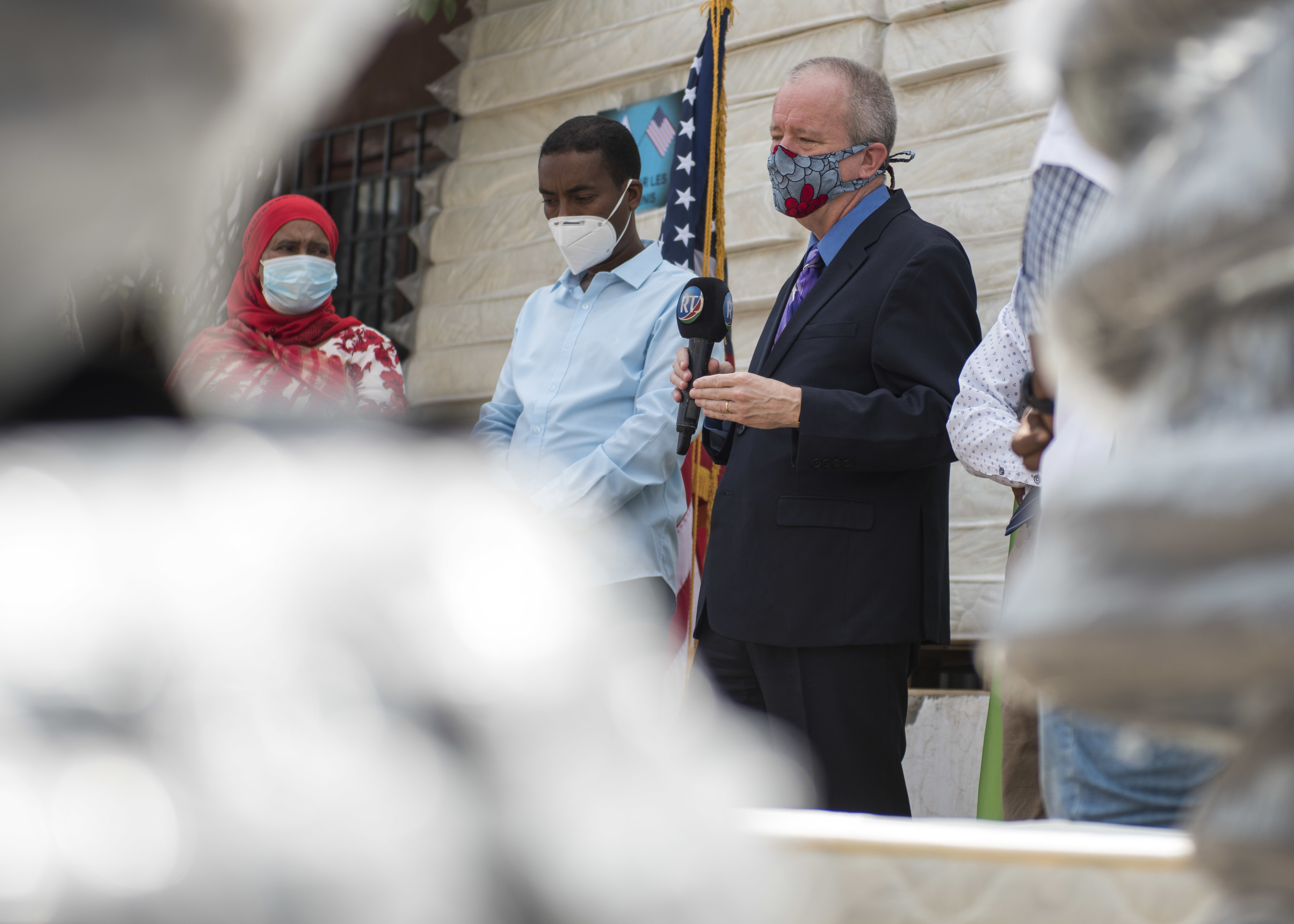 U.S. Ambassador to Djibouti, Larry E. André, listens while Dr. Saleh Bonoita Tourab, Executive Secretary of the Djiboutian Ministry of Health, speaks during a ceremony in which hygiene supplies procured by Combined Joint Task Force-Horn of Africa (CJTF-HOA) were delivered in Djibouti City, Djibouti, June 10, 2020. CJTF-HOA worked to purchase the supplies, valued at approximately $15,000, using Overseas Humanitarian, Disaster, and Civic Aid Appropriation (OHDACA) funds after the Djibouti government made a formal request for assistance to the U.S. Embassy.