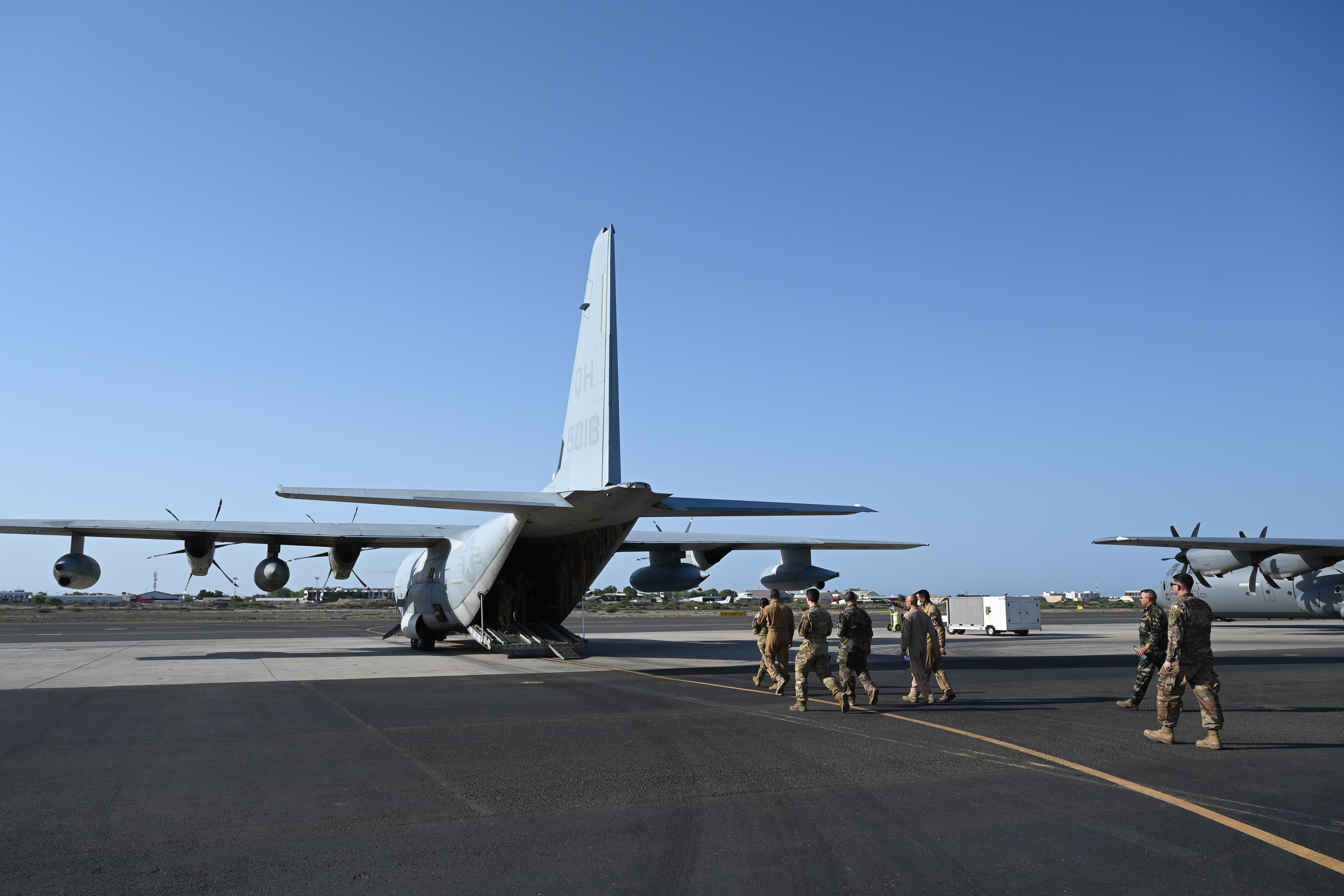 Combined Joint Task Force - Horn of Africa (CJTF-HOA) and French forces in Djibouti leadership board a U.S. Marine KC-130J Super Hercules at Camp Lemonnier, Djibouti, May 24, 2021. The partner forces conducted a joint interoperability training to enhance their capabilities and demonstrate their shared commitment to stability in the region. (U.S. Air Force photo by Staff Sgt. Missy Sterling)