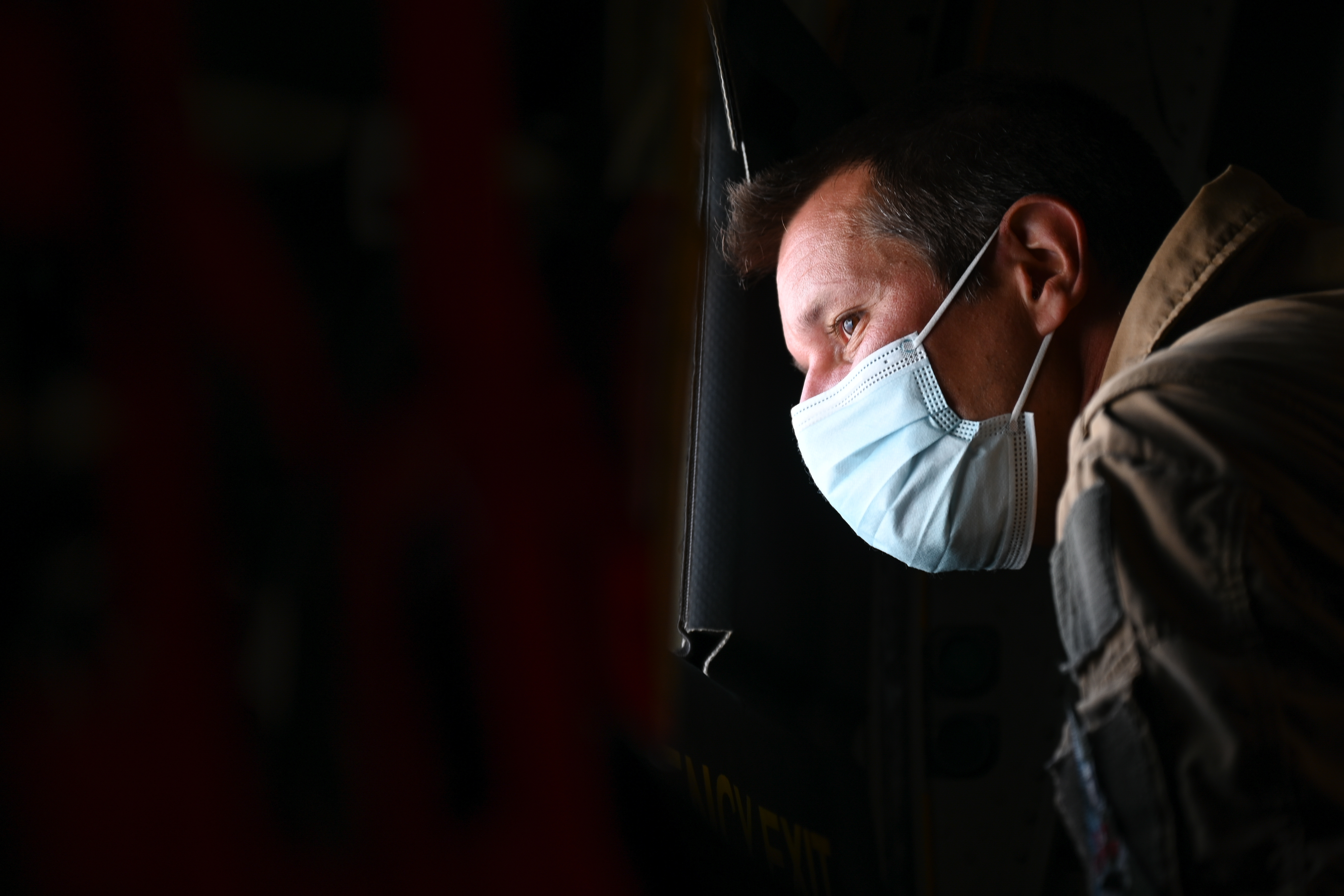 French Air Force Col. Olivier Saunier, the commander of the French Air Base in Djibouti, overlooks Djibouti aboard a U.S. Marine KC-130J Super Hercules, May 24, 2021. Saunier commands roughly 800 airmen and controls assets including the Mirage fighter aircraft, Puma helicopter and a tactical transport aircraft. (U.S. Air Force photo by Staff Sgt. Missy Sterling)