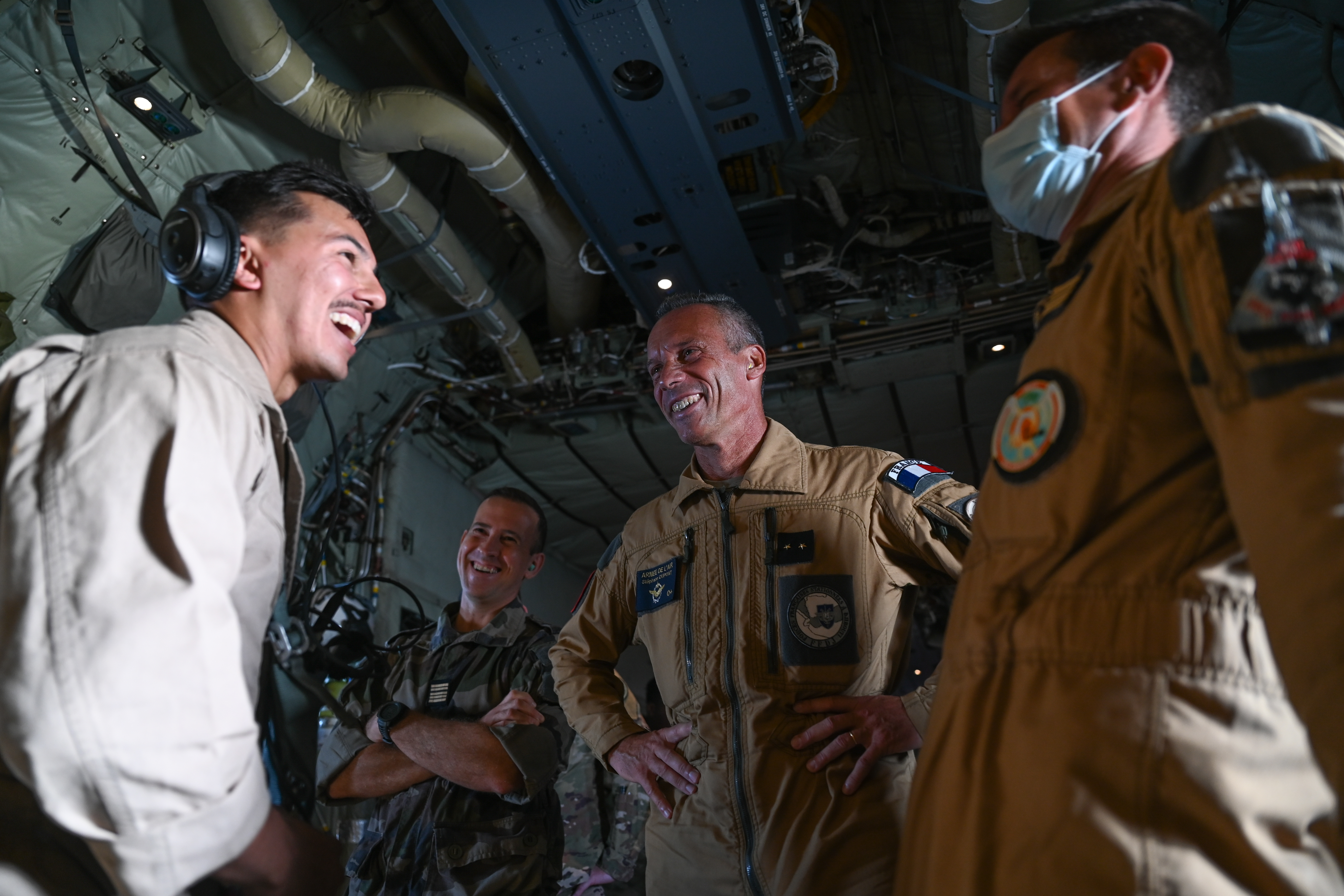 French Air Force Brig. Gen. Stéphane Dupont, center, the commander of French Forces in Djibouti (FFDJ), listens as U.S. Marine Cpl. Taylor Athey, a loadmaster with Marine Aerial Refueler Transport Squadron 234 (VMGR-234), describes how to don a harness aboard a KC-130J Super Hercules in Djibouti, May 24, 2021. The partner forces completed air-to-air refueling and flew an escort mission with a simulated aggressor. (U.S. Air Force photo by Staff Sgt. Missy Sterling)