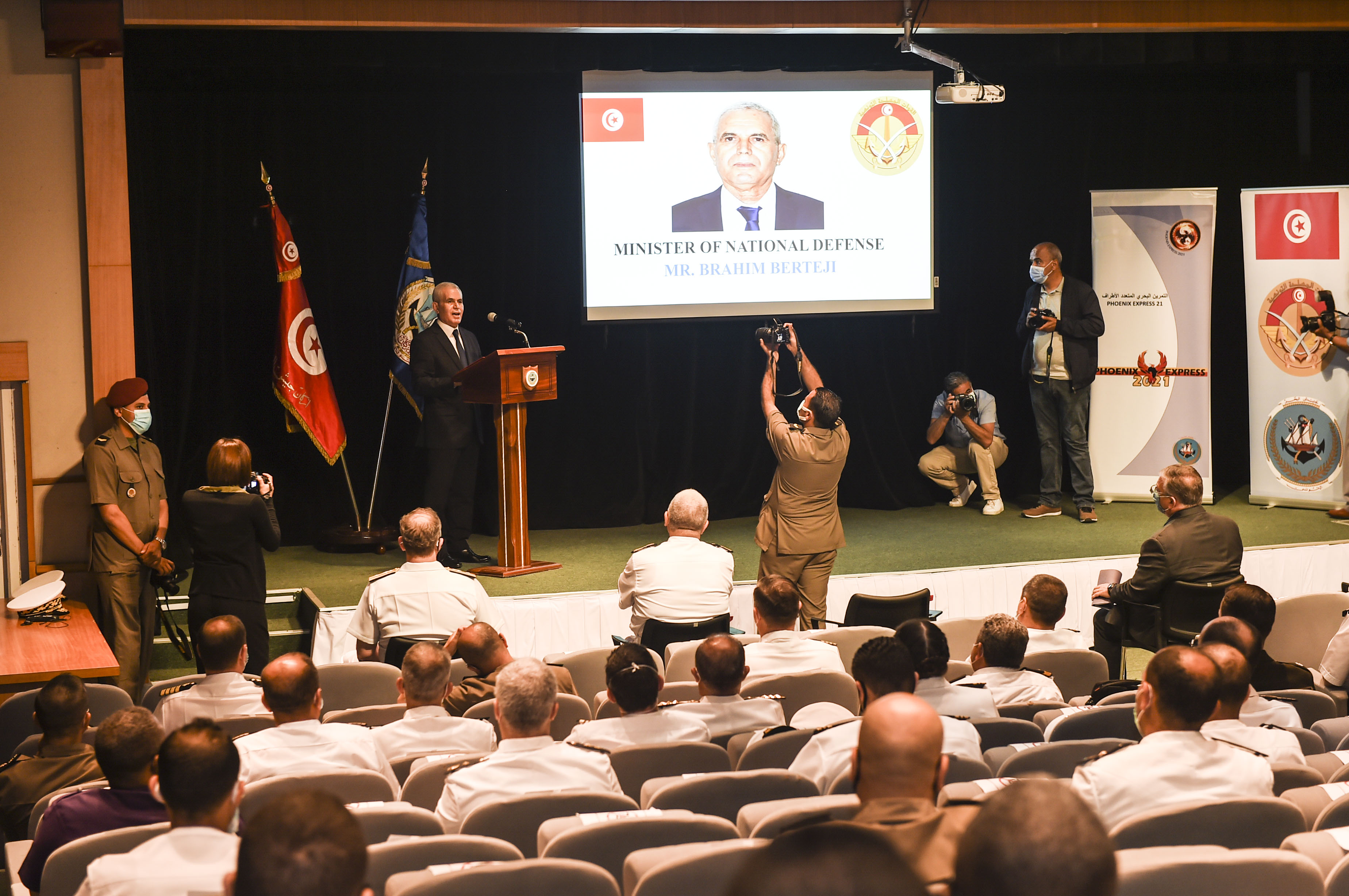 U.S. Naval Forces Europe and Africa (NAVAF) Director of maritime partnership program, Rear Adm. Jeffrey S. Spivey joined Tunisian Minister of Defense Brahim Bertegi, Read Adm. Kevin Jones from U.S. Africa Command (AFRICOM), and U.S. Ambassador to Tunisia, Donald Blome in marking the successful completion of the 16th iteration of the multinational maritime exercise Phoenix Express 2021 (PE21) in Tunis, Tunisia on May 28, 2021.