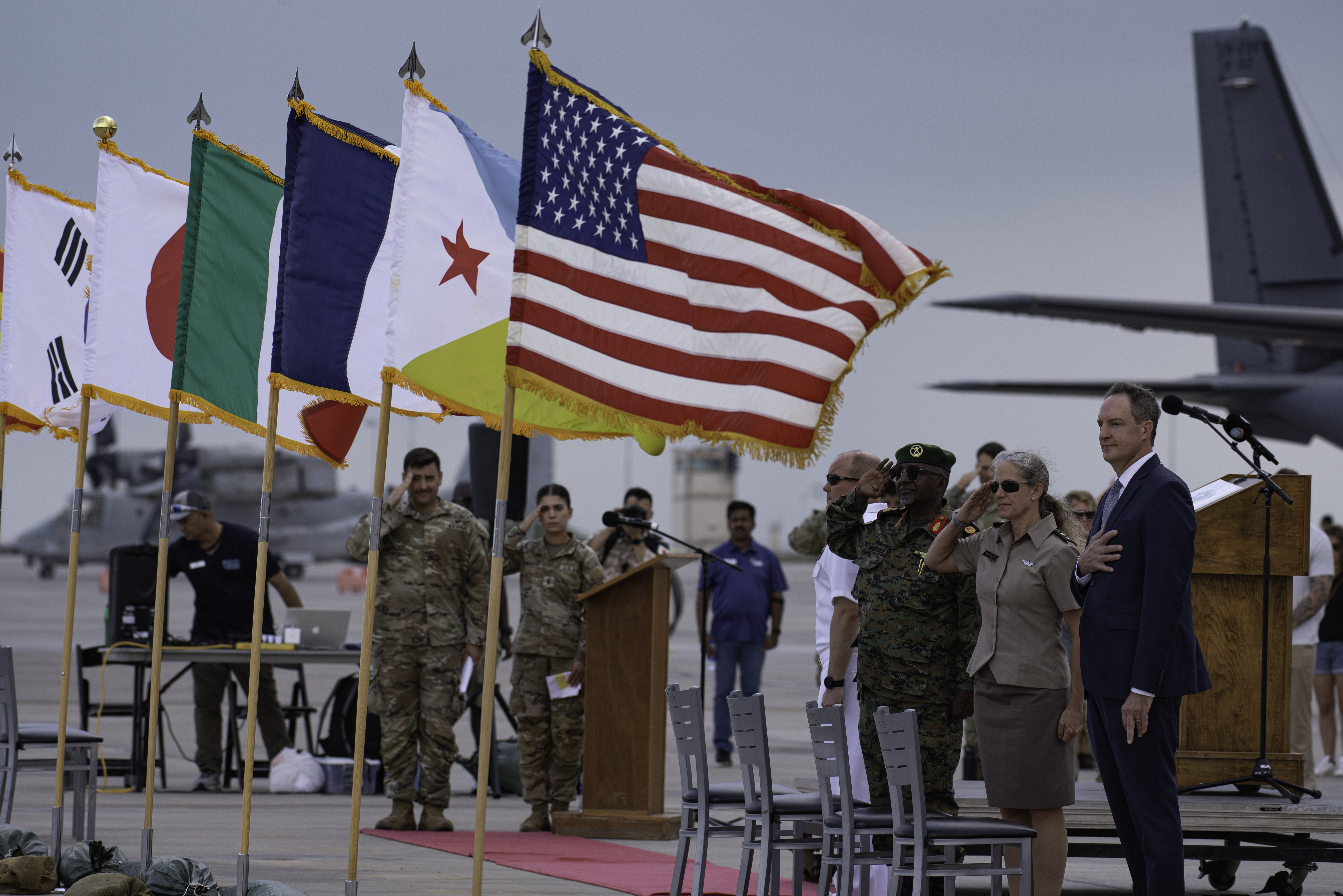 From left to right, U.S. Navy Capt. Brian Iber, Camp Lemonnier commanding officer; Djibouti Armed Forces Col. Maj. Mohamed Guelleh, senior official of Forces Armees Djiboutiennes; U.S. Army Maj. Gen. Jami Shawley, Combined Joint Task Force - Horn of Africa commanding general; and the Honorable Jonathan Pratt, U.S. Ambassador to Djibouti, salute the U.S. and Djibouti flag during the national anthem at a Partner Appreciation Day 2022 event at Camp Lemonnier, Djibouti, on Nov. 10, 2022. Pratt and Shawley spoke at the ceremony about the power of cooperation and the enduring friendship among the task force partner nations.
