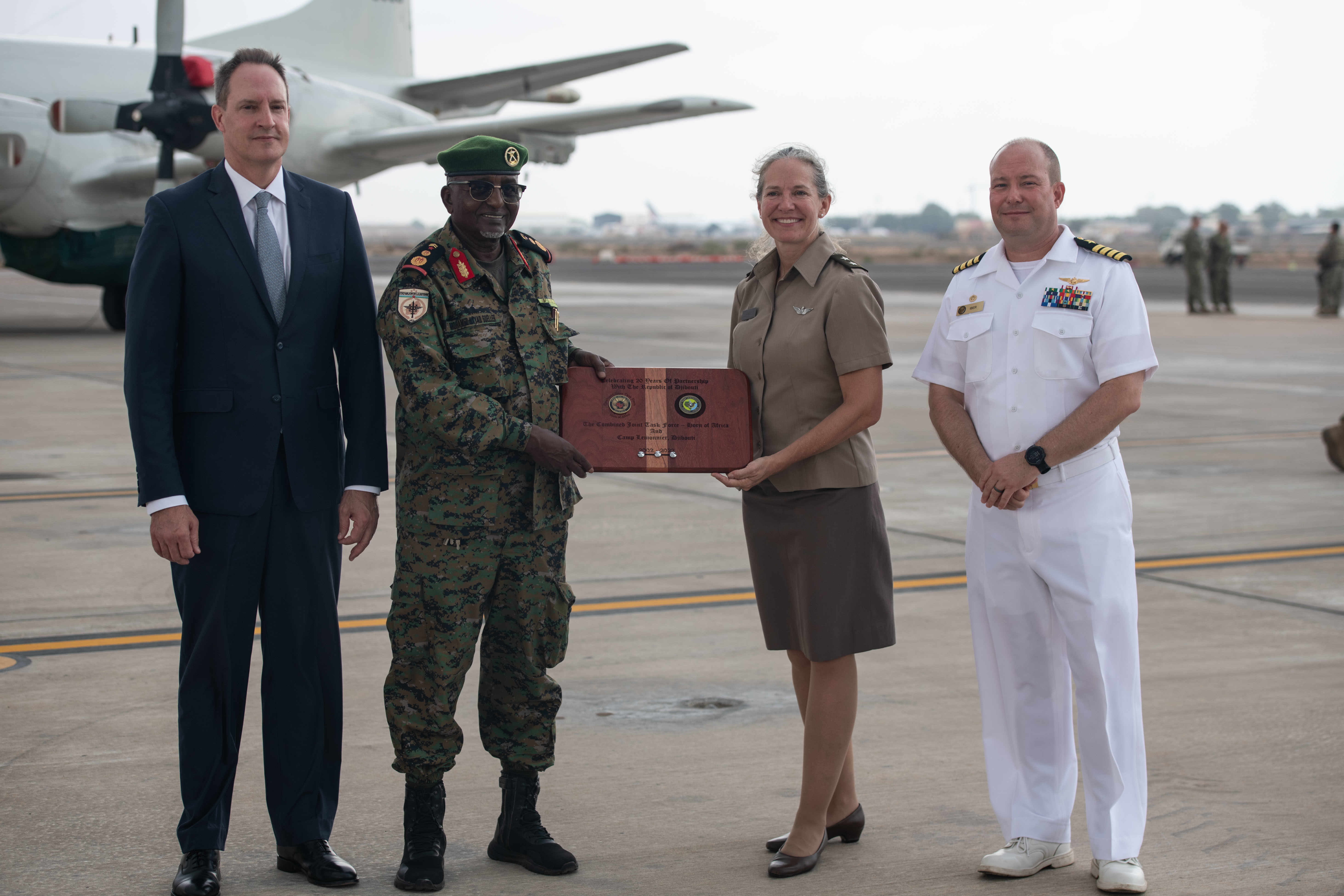 From left to right, the Honorable Jonathan Pratt, U.S. Ambassador to Djibouti; Djibouti Armed Forces Col. Maj. Mohamed Guelleh, senior official of Forces Armees Djiboutiennes; U.S. Army Maj. Gen. Jami Shawley, Combined Joint Task Force - Horn of Africa commanding general; and U.S. Navy Capt. Brian Iber, Camp Lemonnier commanding officer, pose for a photo during the CJTF-HOA Partner Appreciation Day 2022 event at Camp Lemonnier, Djibouti, on Nov. 10, 2022. The plaque was presented to Gueller as a symbol of appreciation for the 20 years of partnership and cooperation between the U.S. and Djiboutian governments.