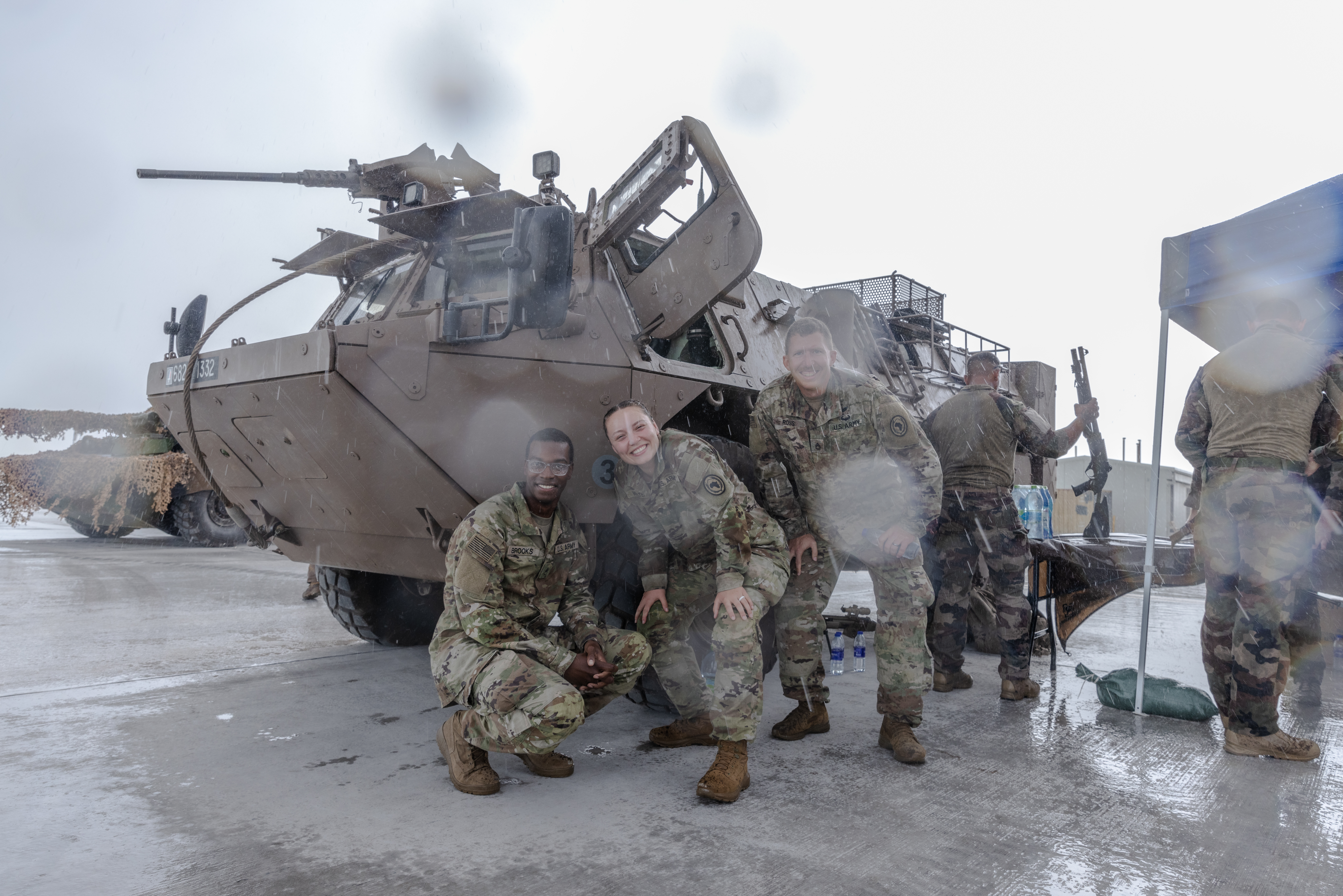 U.S. service members pose for a photo next to an armored vehicle display during the Combined Joint Task Force - Horn of Africa Partner Appreciation Day 2022 event at Camp Lemonnier, Djibouti, on Nov. 10, 2022. Task force allies and partners set up static and interactive displays to showcase their combined military capabilities.