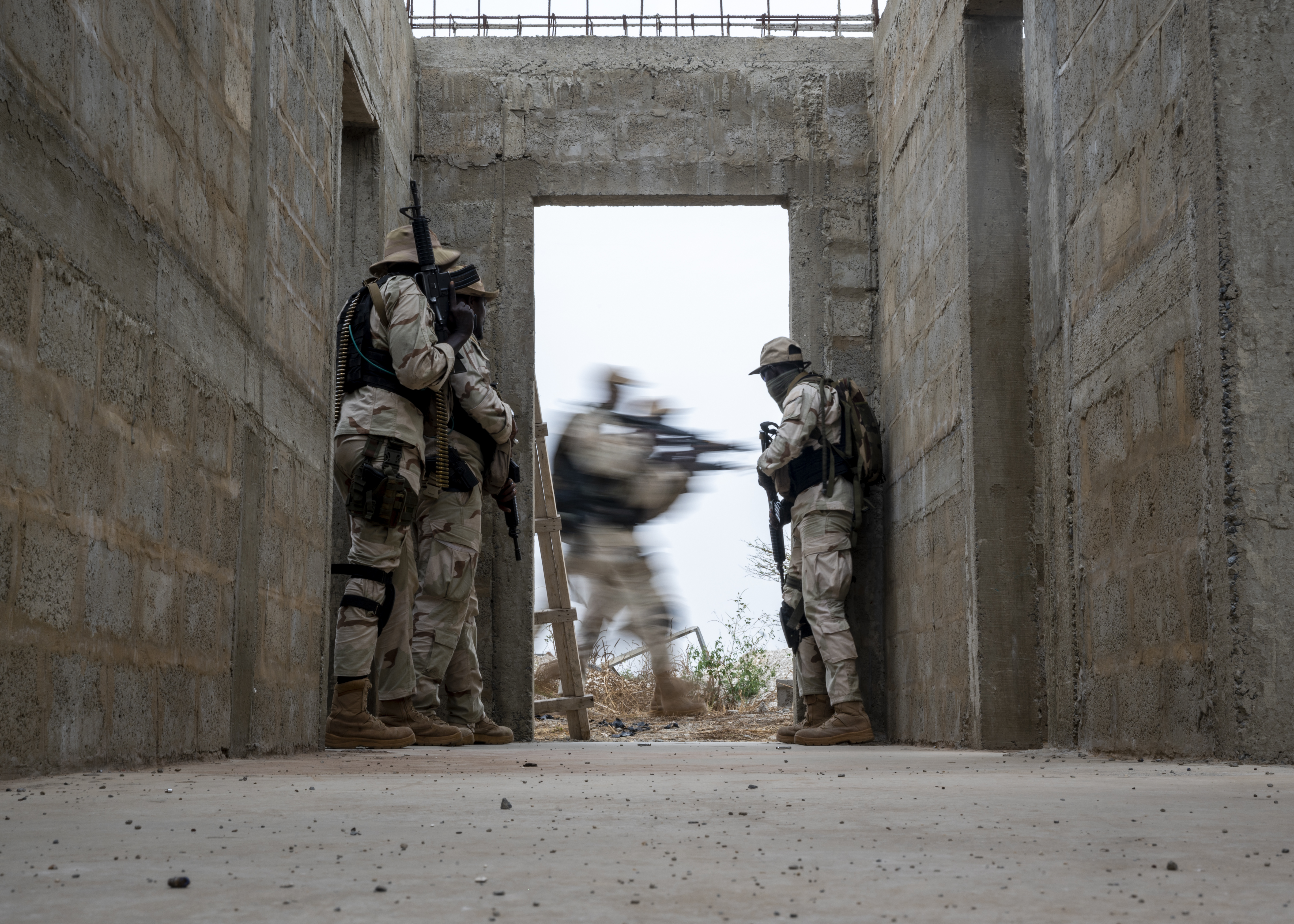 Senegal Maritime Special Forces soldiers assault to an objective while conducting a raid during a Joint Combined Exchange Training in Dakar, Senegal, on Nov. 11, 2021. JCETs enhance U.S. relationships with partner nations by developing and maintaining critical military-to-military connections and improving joint and allied readiness and interoperability.
