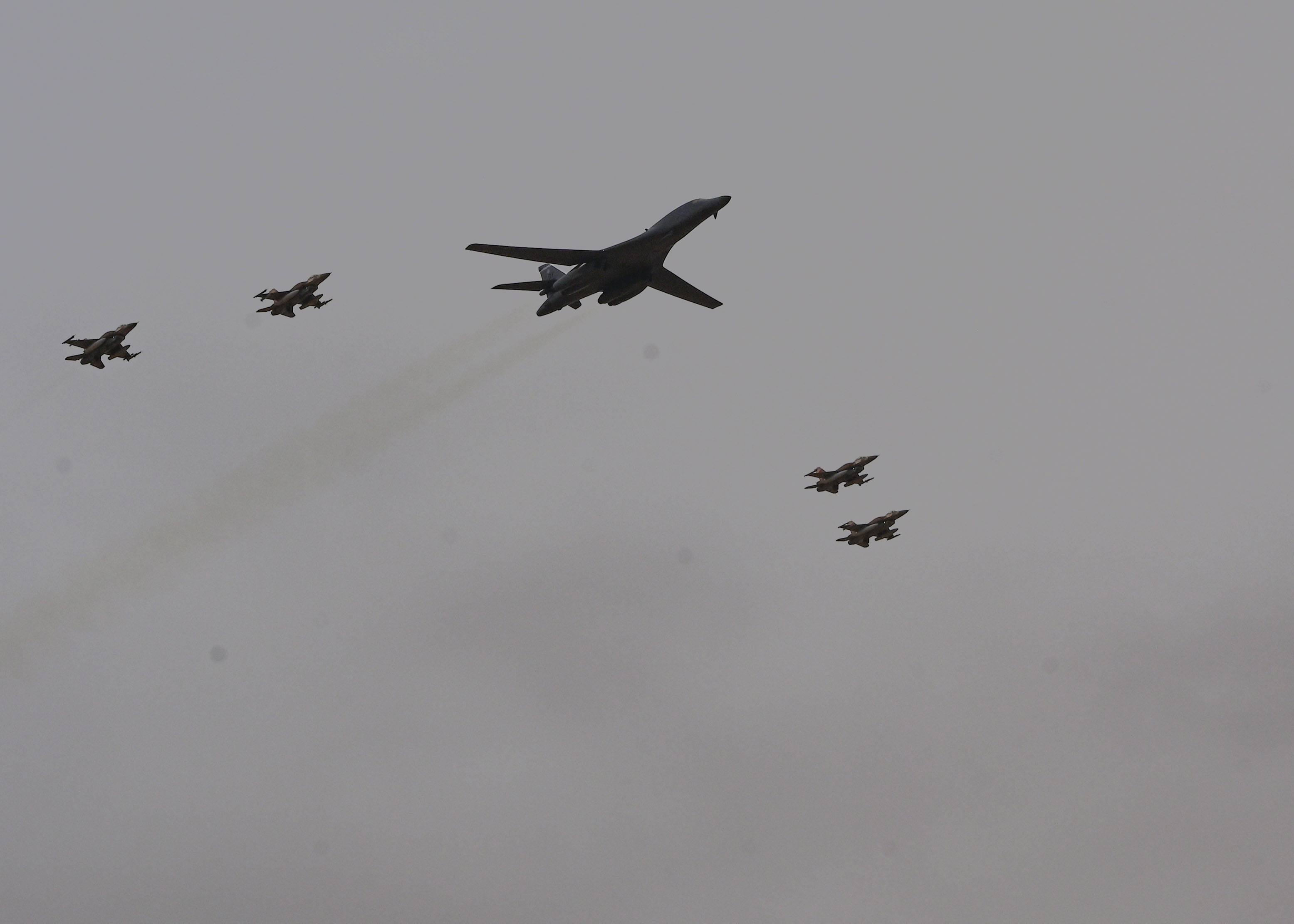 U.S. Army and Royal Moroccan Armed Forces demonstrate the strength of their air domain capabilities with a B-1 Bomber and F-16 Fighting Falcons fly over for distinguished visitors during African Lion 2023 in Tantan, Morocco, June 16, 2023. Eighteen nations and approximately 8,000 personnel will participate in African Lion 2023, U.S. Africa Command's largest annual combined, joint exercise that will take place in Ghana, Morocco, Senegal and Tunisia from May 13-June 18, 2023.(U.S. Army photo by Sgt. Natalie Pantalos)