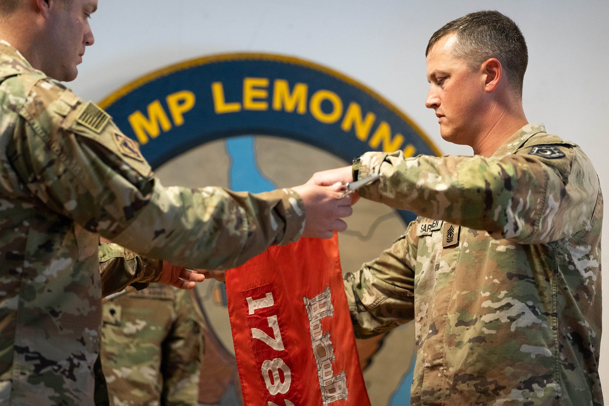 1st Sgt. Michael Sarkkinen, 1782nd Engineer Support Company first sergeant, unfurls his unit’s guidon during their transfer of authority ceremony at Camp Lemonnier, Djibouti, Oct. 18, 2023. The 1782nd ESC arrived from South Carolina to take up the engineering mission at Combined Joint Task Force-Horn of Africa.