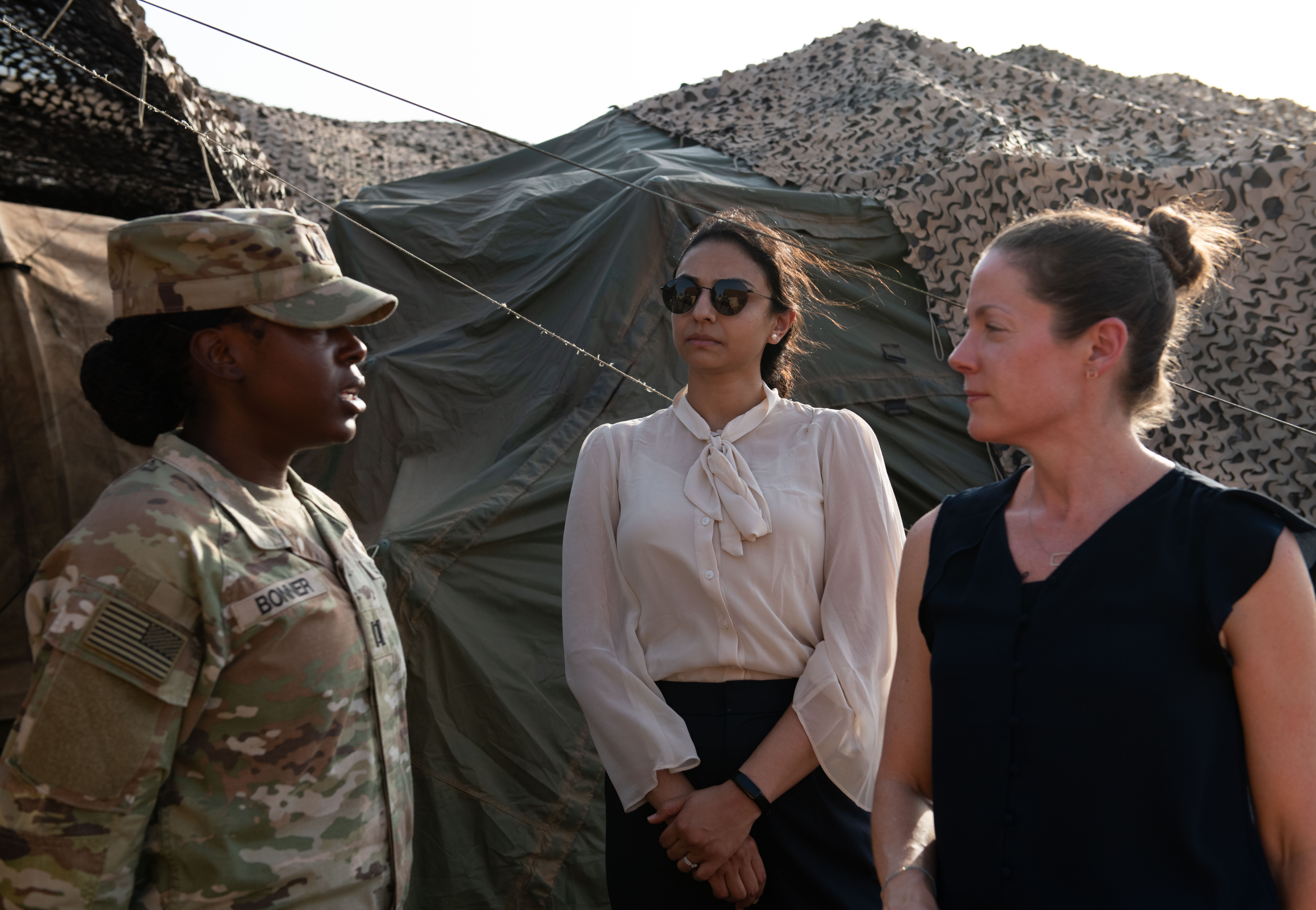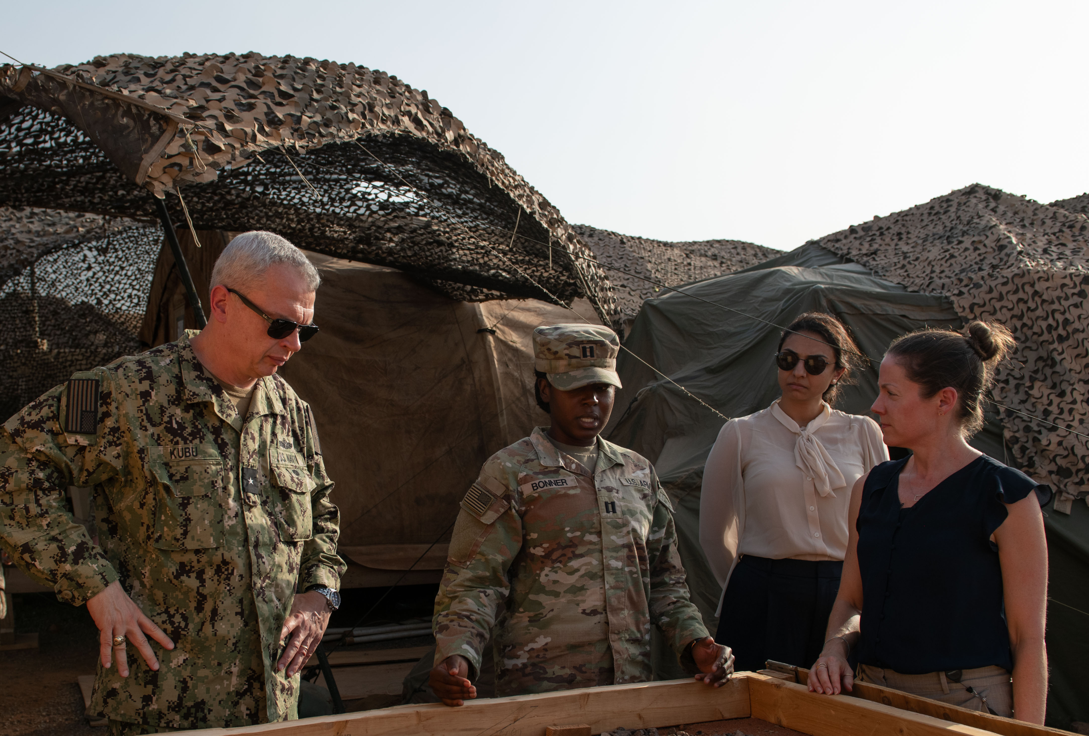 U.S. Army Capt. Trudy Bonner, battery commander assigned to Chabelley Airfield, left, talks to Maureen E. Farrell, deputy assistant secretary of defense for African affairs, third from left, at Chabelley Airfield, Djibouti, Sept. 9, 2024. Farrell visited Camp Lemonnier and Chabelley Airfield to observe defensive and security protocols. (U.S. Air National Guard photo by Tech. Sgt. Kathleen LaCorte)