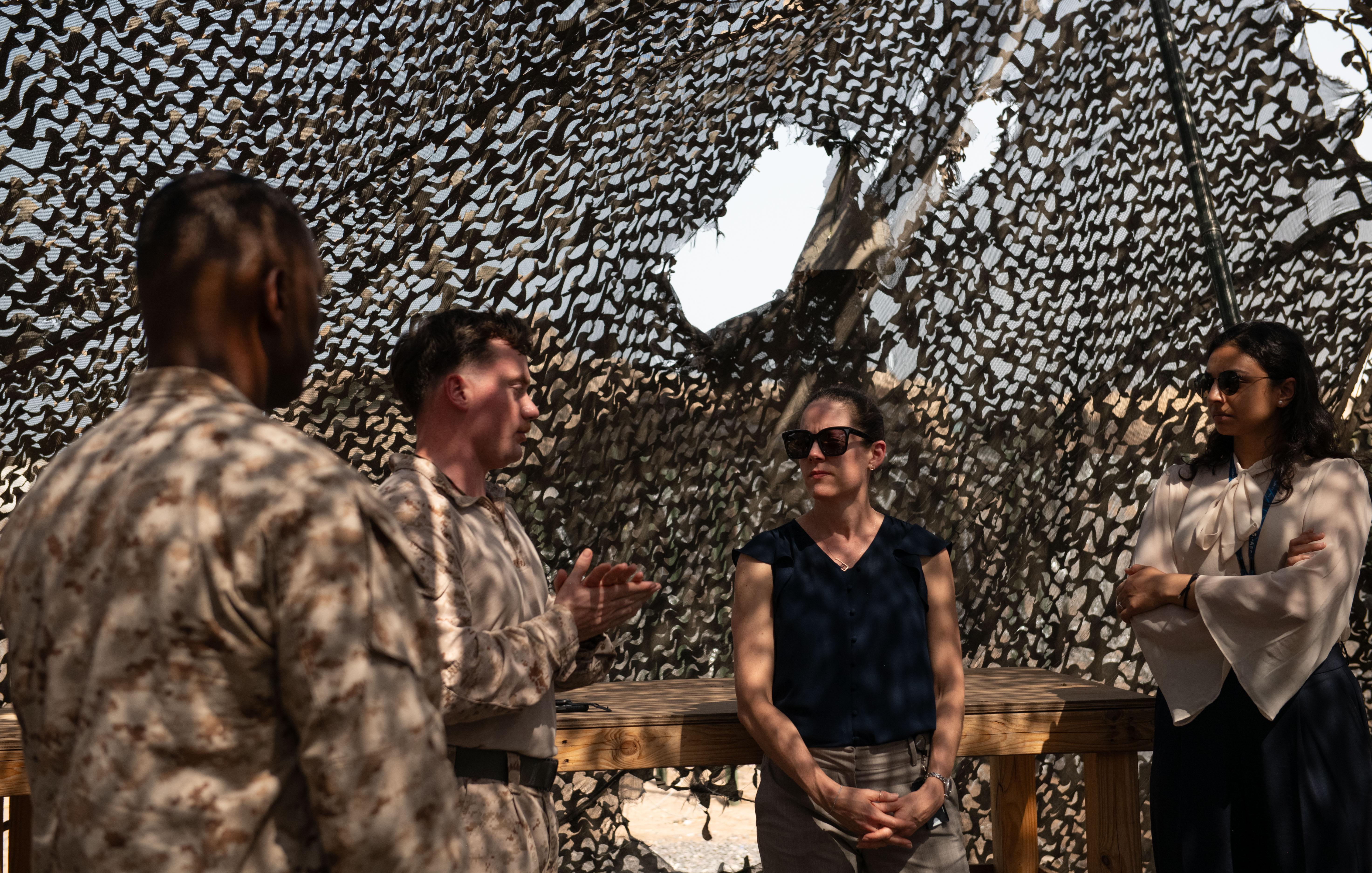 U.S. Marines assigned to Combined Joint Task Force-Horn of Africa, talk to Maureen E. Farrell, deputy assistant secretary of defense for African affairs, third from left, at Camp Lemonnier, Djibouti, Sept. 9, 2024. Farrell visited Camp Lemonnier and Chabelley Airfield to observe defensive and security protocols. (U.S. Air National Guard photo by Tech. Sgt. Kathleen LaCorte)