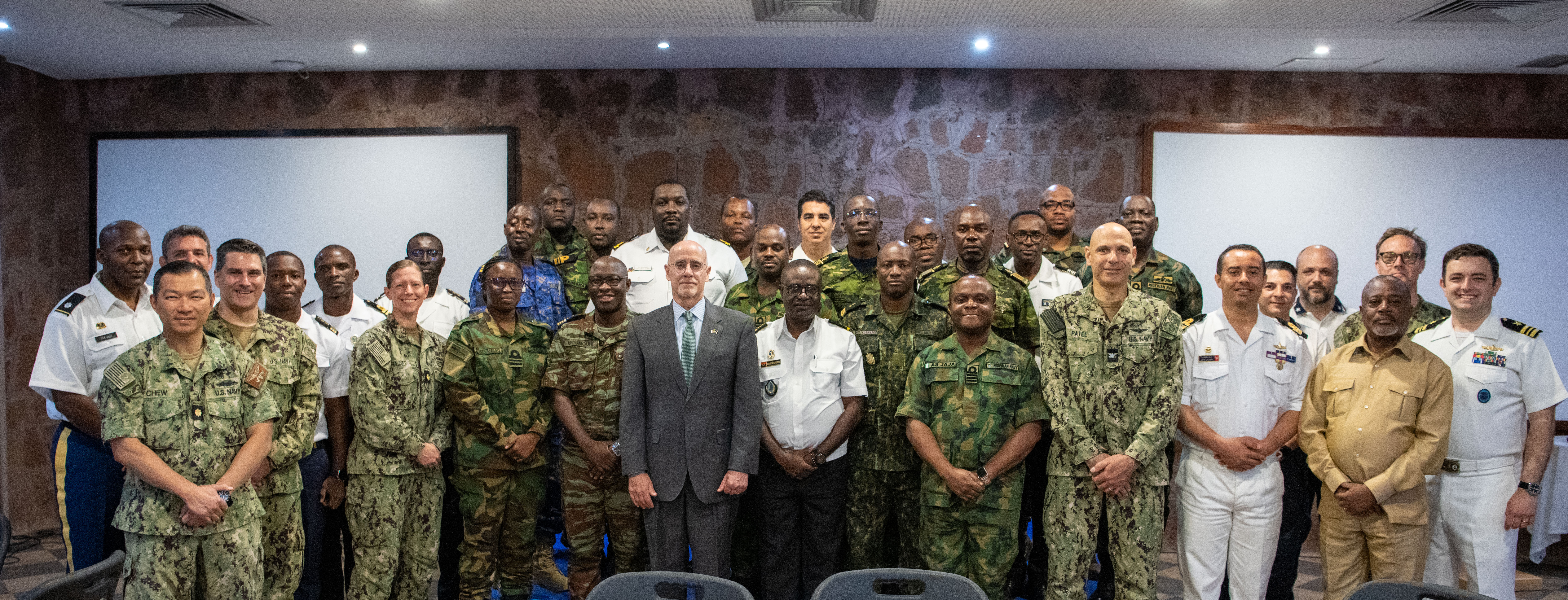 250514-N-RO855-1390 PRAIA, Cabo Verde (May 14, 2025) – U.S. Africa Command Ambassador Robert Scott, gathers with members of the Zone G Multinational Maritime Coordination Center, during Obangame Express 2025. Obangame Express is one of three regional maritime exercises led by U.S. Sixth Fleet as part of a comprehensive strategy to provide collaborative opportunities to African forces and international partners to address maritime security concerns. (U.S. Navy photo by Mass Communication Specialist 2nd Class Caleb M. Foote)