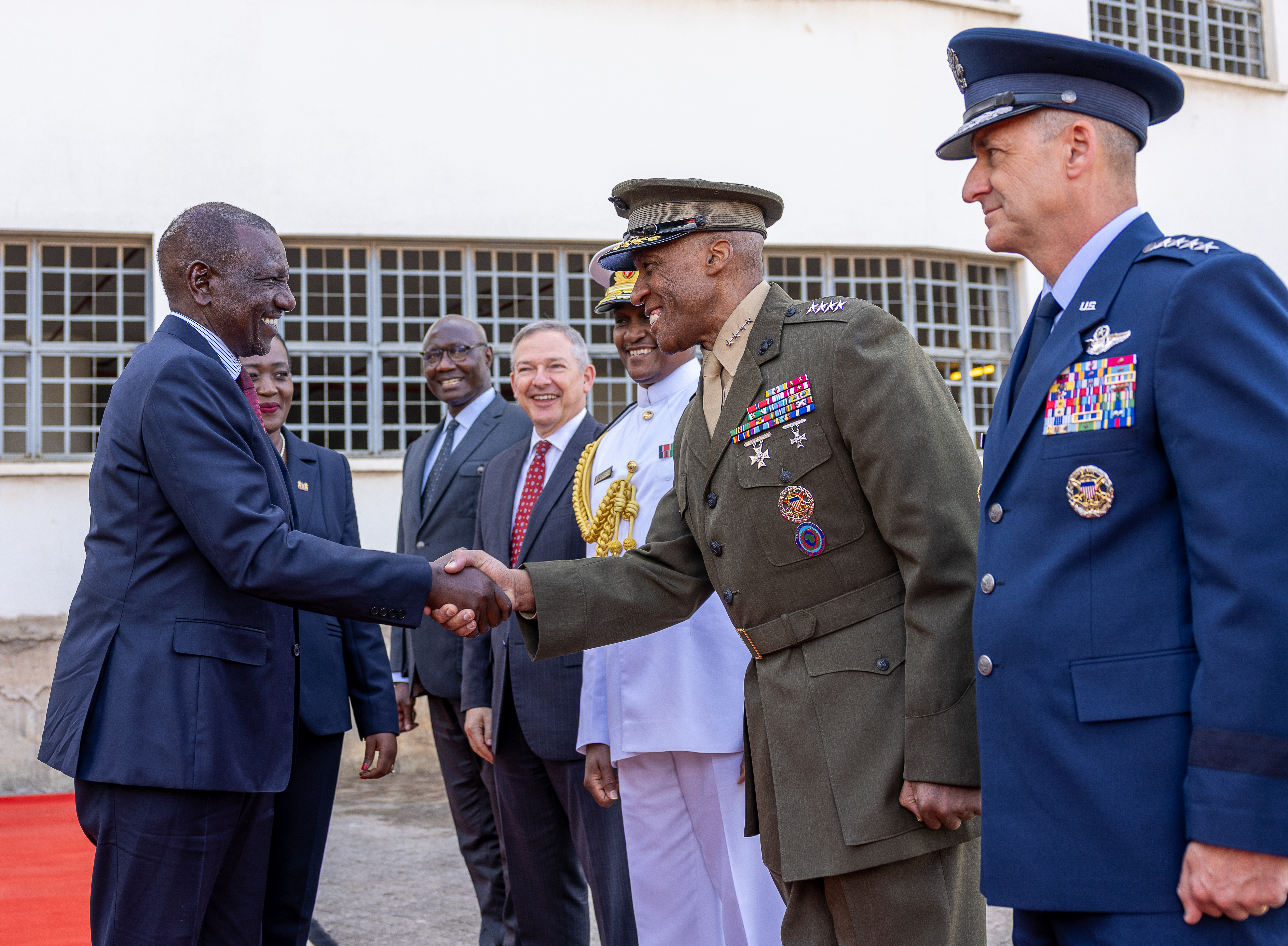 His Excellency Dr. William Samoei Ruto, C.G.H., President of the Republic of Kenya and Commander-in-Chief of the Defence Forces (left) greets U.S. Marine Corps Gen. Michael E. Langley, commander U.S. Africa Command and U.S. Air Force Gen. Steven Nordhaus, Chief of the National Guard Bureau, during the opening ceremony for the 2025 African Chiefs of Defense conference, May 28, 2025.