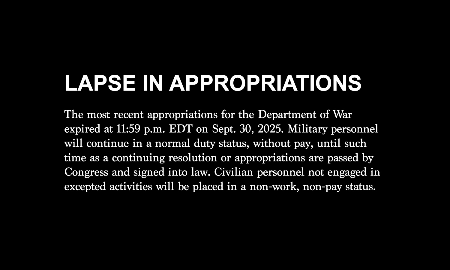 The most recent appropriations for the Department of War expired at 11:59 p.m. EDT on Sept. 30, 2025. Military personnel will continue in a normal duty status, without pay, until such time as a continuing resolution or appropriations are passed by Congress and signed into law. Civilian personnel not engaged in excepted activities will be placed in a non-work, non-pay status.