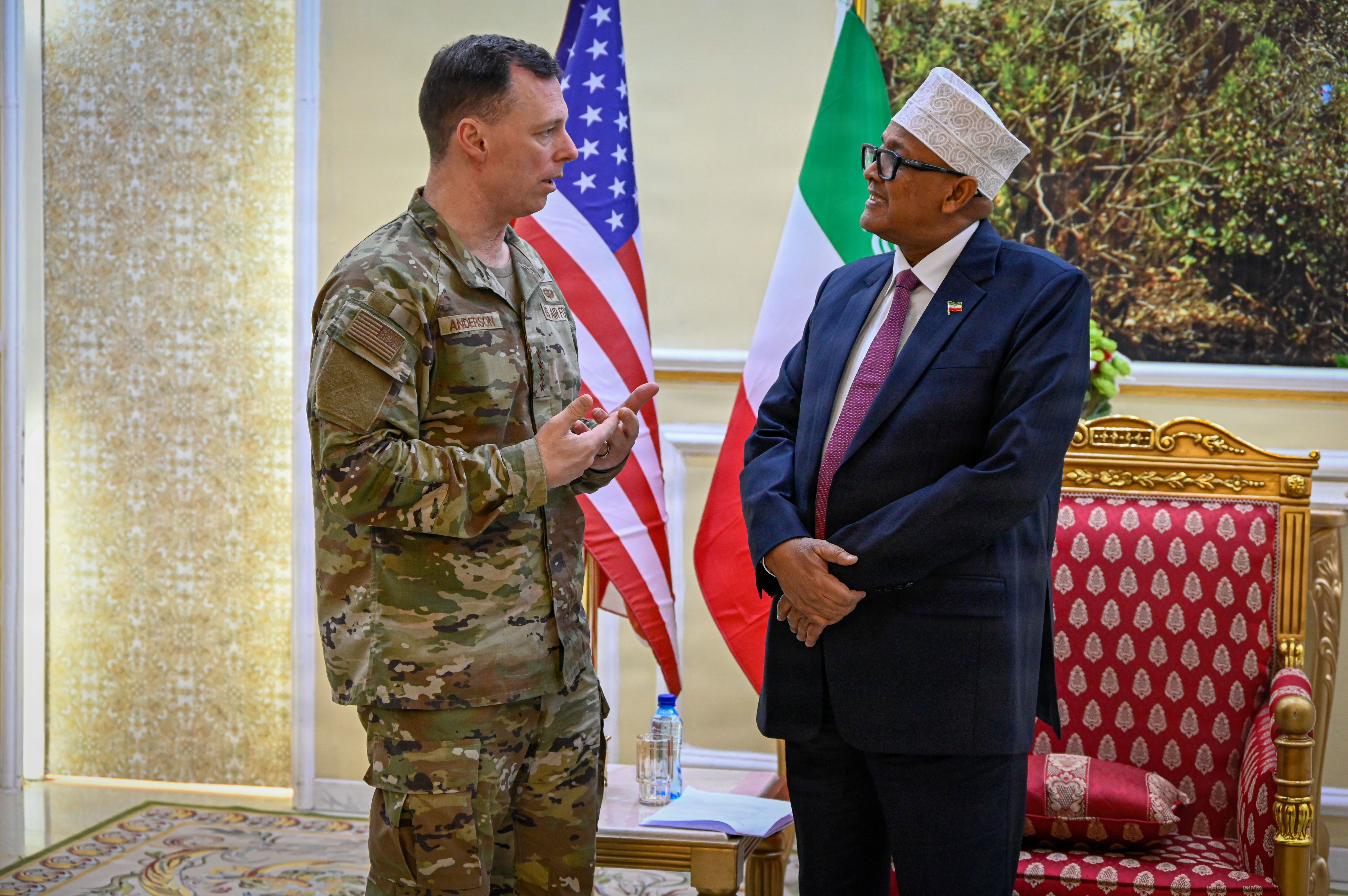 U.S. Air Force Gen. Dagvin Anderson, commander, U.S. Africa Command (AFRICOM), meets with President Abdirahman Mohamed Abdullahi, president of Somaliland, in Hargeisa, Somaliland, Nov. 26, 2025. The meeting was part of Gen. Anderson’s trip in East Africa to meet with government and defense leaders to strengthen America’s strategic approach to confronting terrorism through mutual engagement, stronger cooperation, and aligned security priorities. (U.S. Army photo by Cpt. Ubon Mendie)