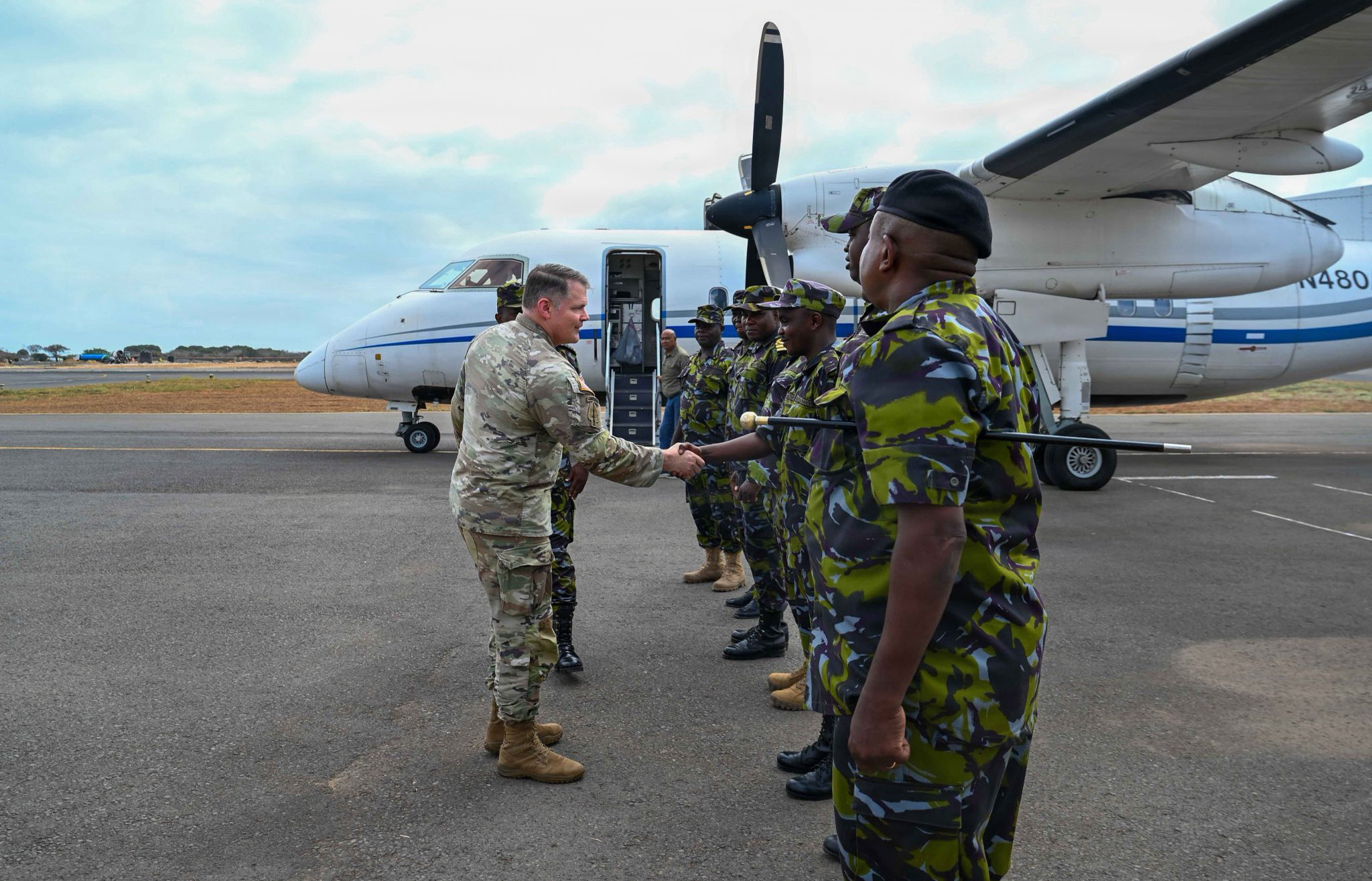 U.S. Army Lt. Gen. John Brennan, U.S. Africa Command, deputy commander, greets members of the Kenya Defence Force at Manda Bay, Kenya, Feb. 6, 2026. At Camp Simba, U.S. service members and Kenyan partners are directly supporting counterterrorism operations in East Africa, particularly in Somalia. (U.S. Army photo by Sgt. Vivian Nakaana)