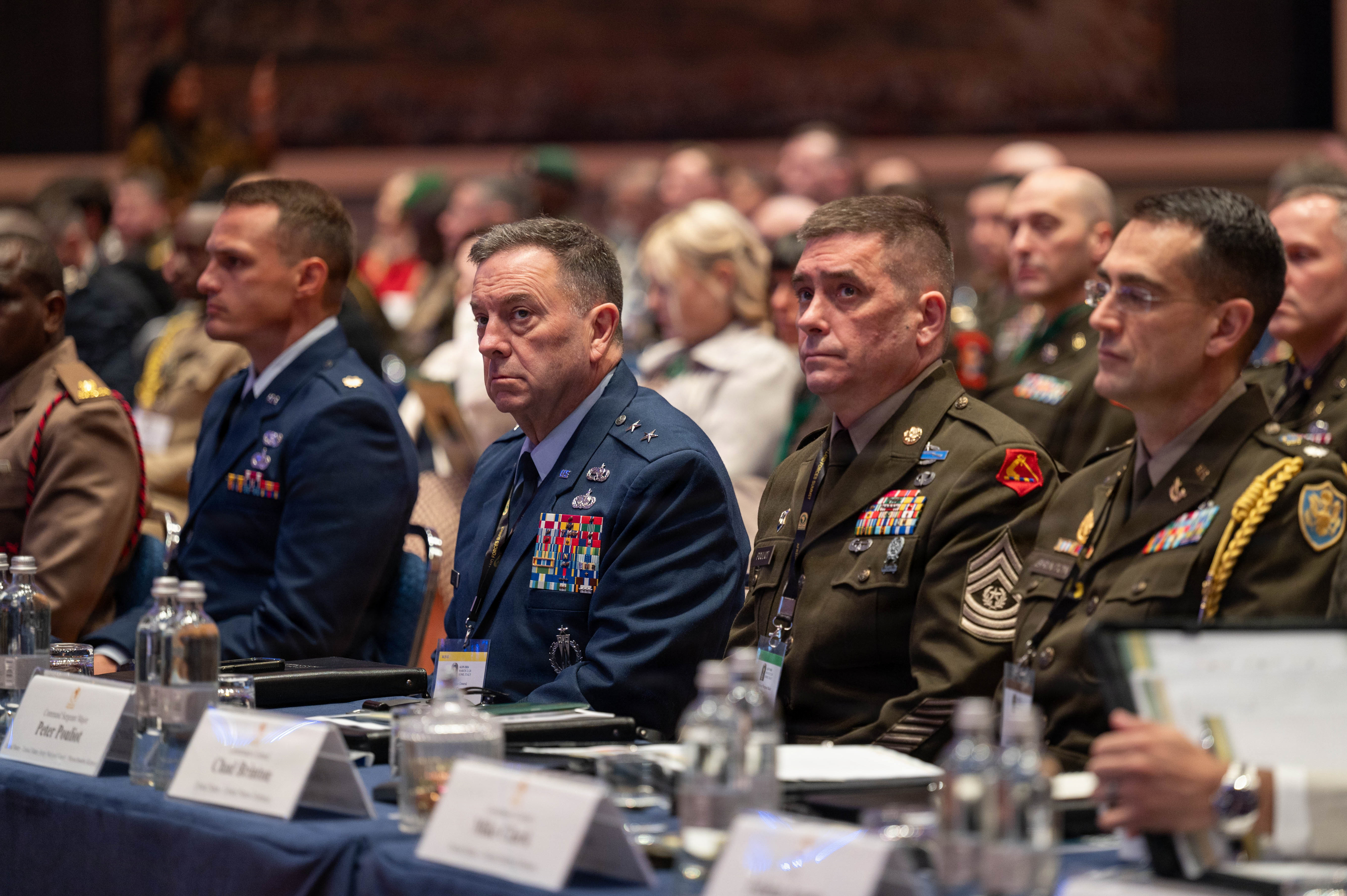 U.S. Air Force Maj. Gen. Gary Keefe, the Adjutant General of the Massachusetts National Guard (MANG), left, and U.S. Army Command Sgt. Maj. Peter Pouliot, senior enlisted advisor to the Adjutant General of the MANG, listen to the opening remarks of the African Land Forces Summit in Rome, Italy, March 23, 2026. Senior leaders from the MANG attended the summit alongside senior leaders of the Kenya Defence Forces, marking over a decade of partnership through the State Partnership Program and underscoring the enduring strategic value of a relationship that has strengthened global security, regional stability and joint operational effectiveness.