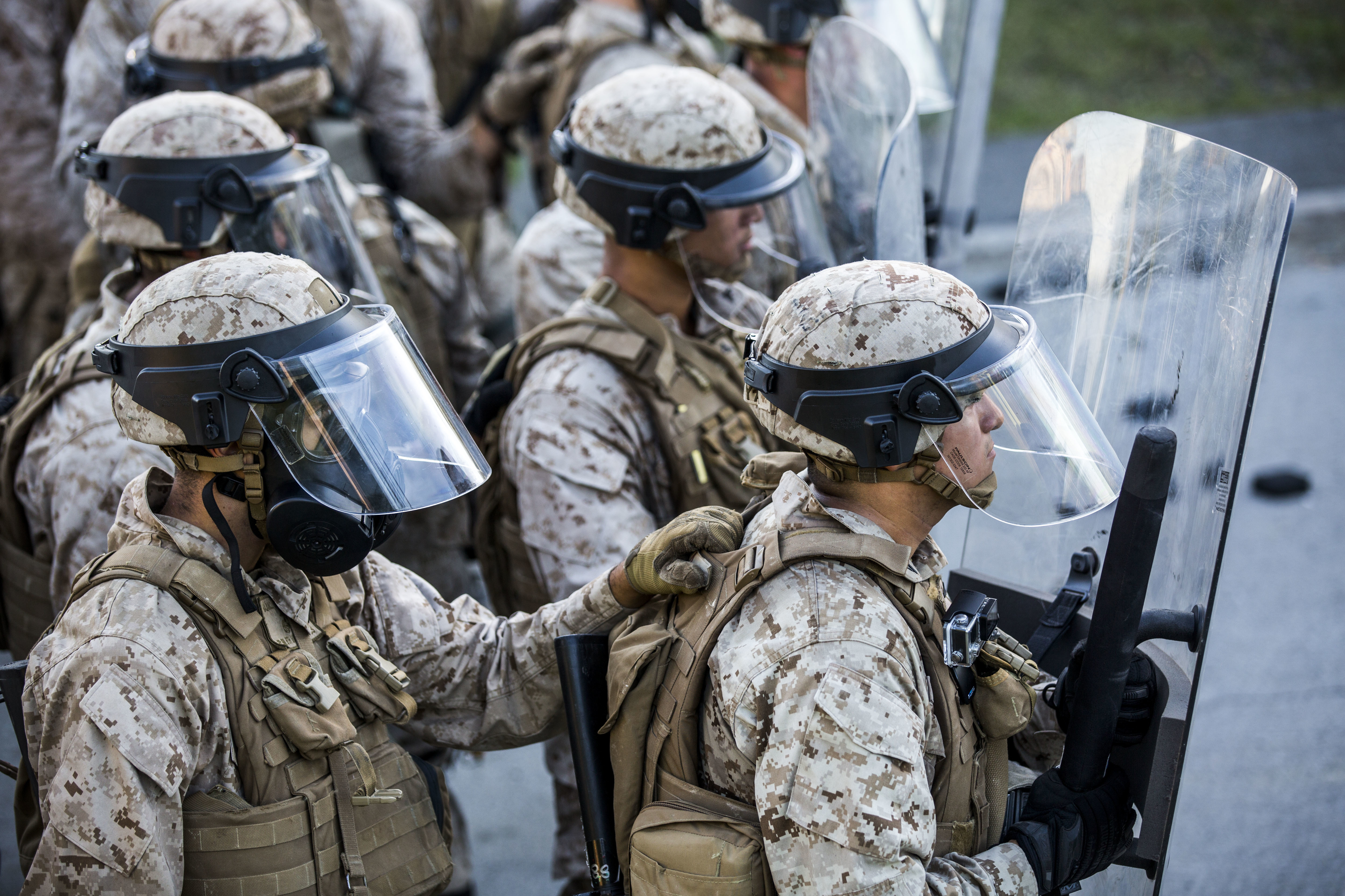 U.S. Marines guard a simulated embassy during a riot control exercise at the National Gendarmerie Tactical Training Center in Saint-Astier, France, Oct. 9. The Marines with Special-Purpose Marine Air-Ground Task Force Crisis Response-Africa worked with French Gendarmes, continuing a strong partnership between the two units. (U.S. Marine Corps photo by Staff Sgt. Vitaliy Rusavskiy)